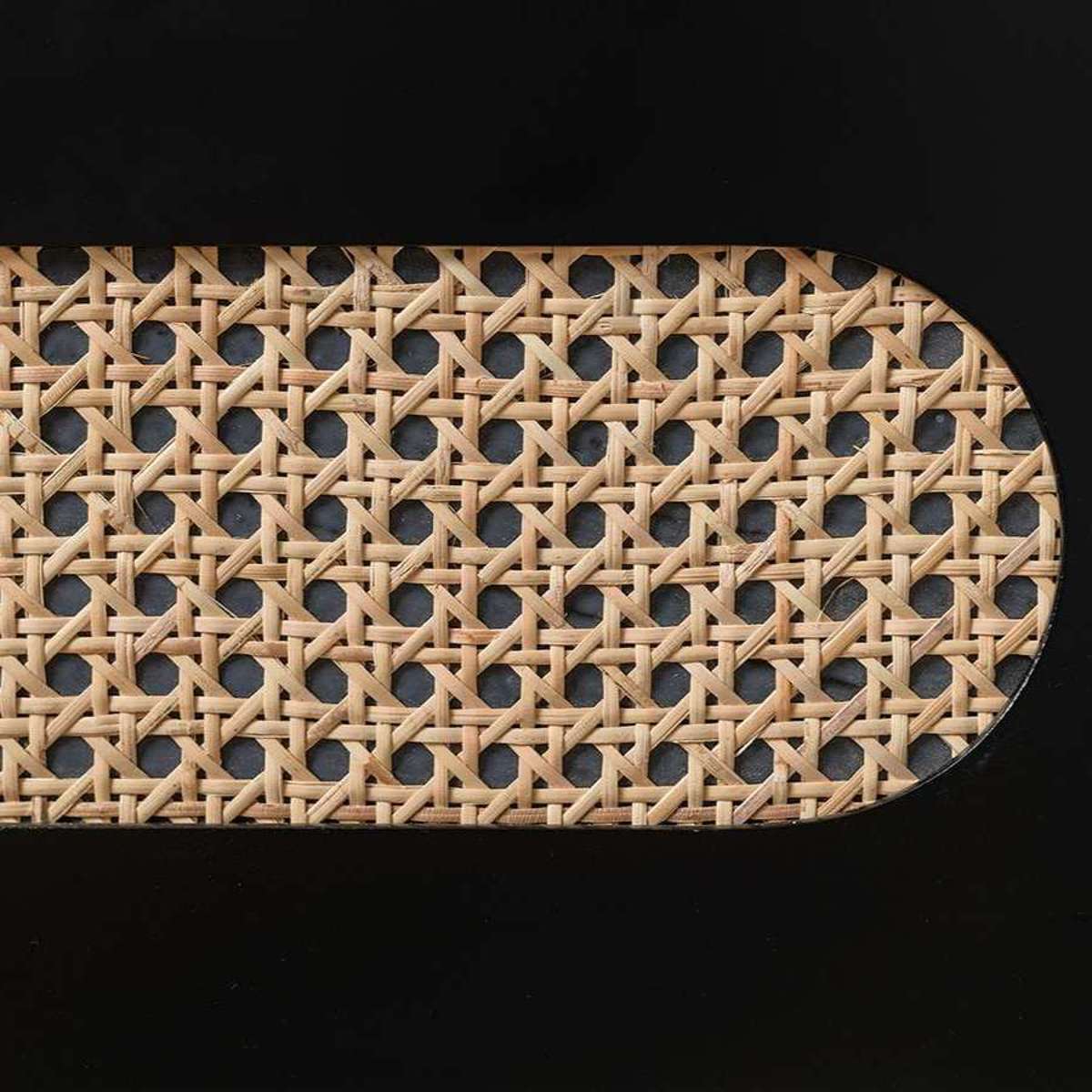- The sliding drawer features a woven rattan cut-out in an obround shape