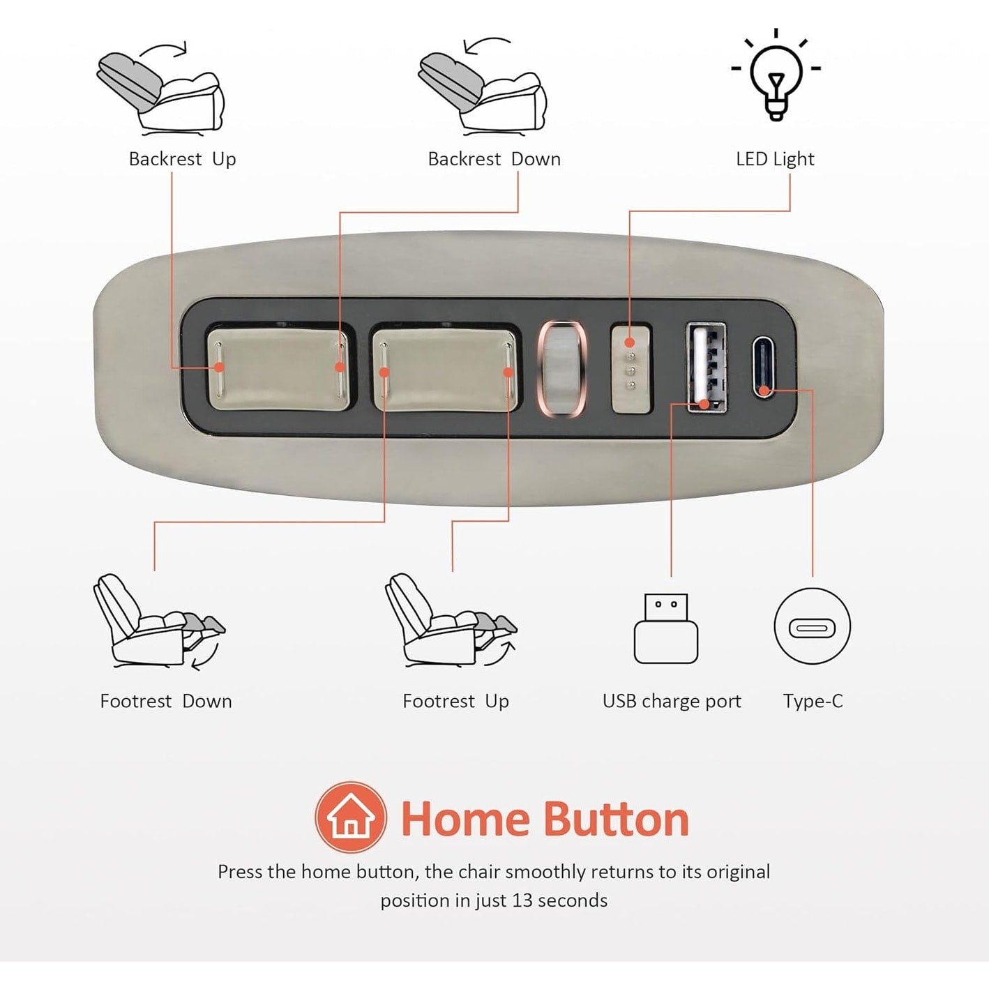 ONE-TOUCH RESET & LED LIGHTING. Press the home button, and the chair smoothly returns to its original position in just 13 seconds. The dual USB &Type C ports on the armrest support any phone or pad, and LED lighting for added relaxation