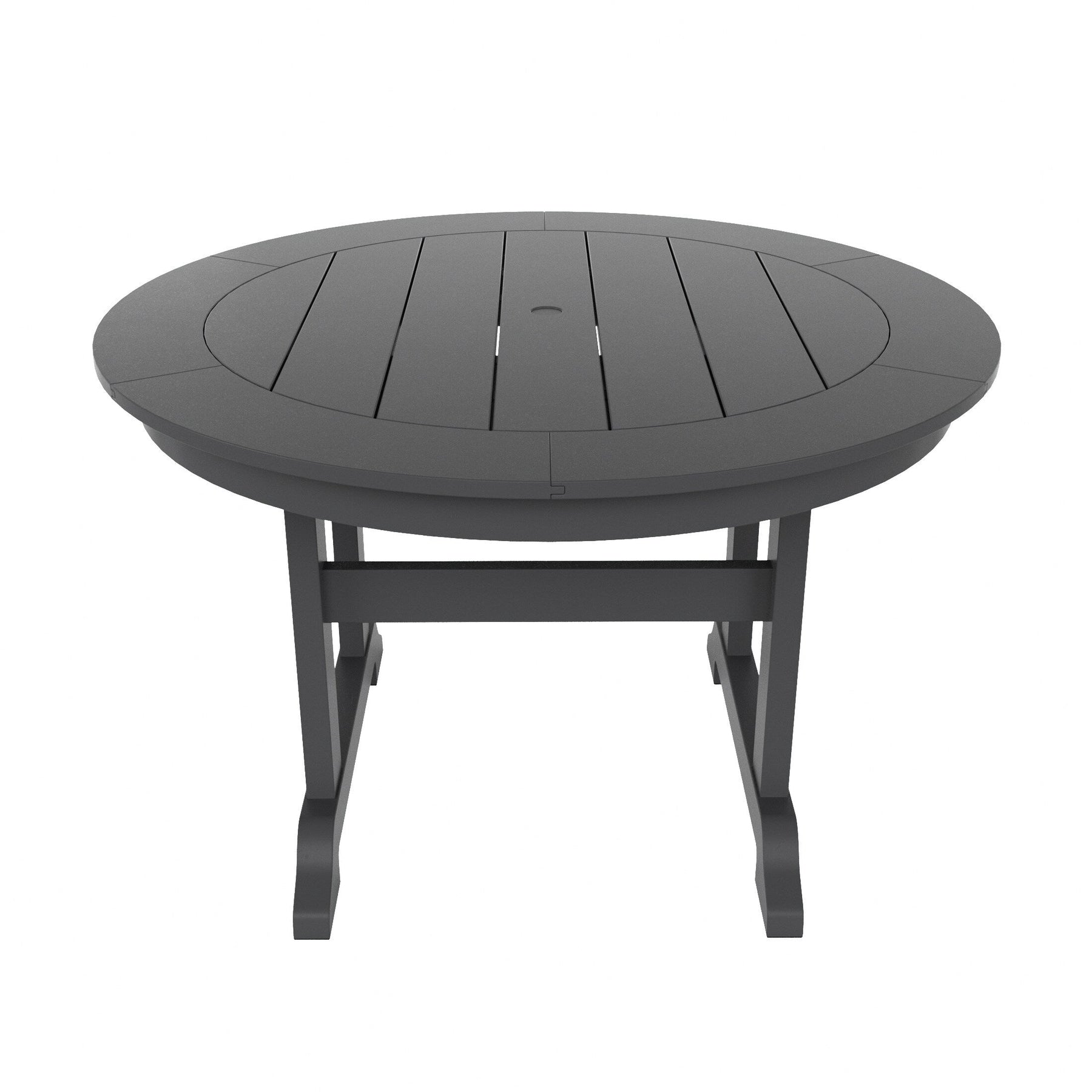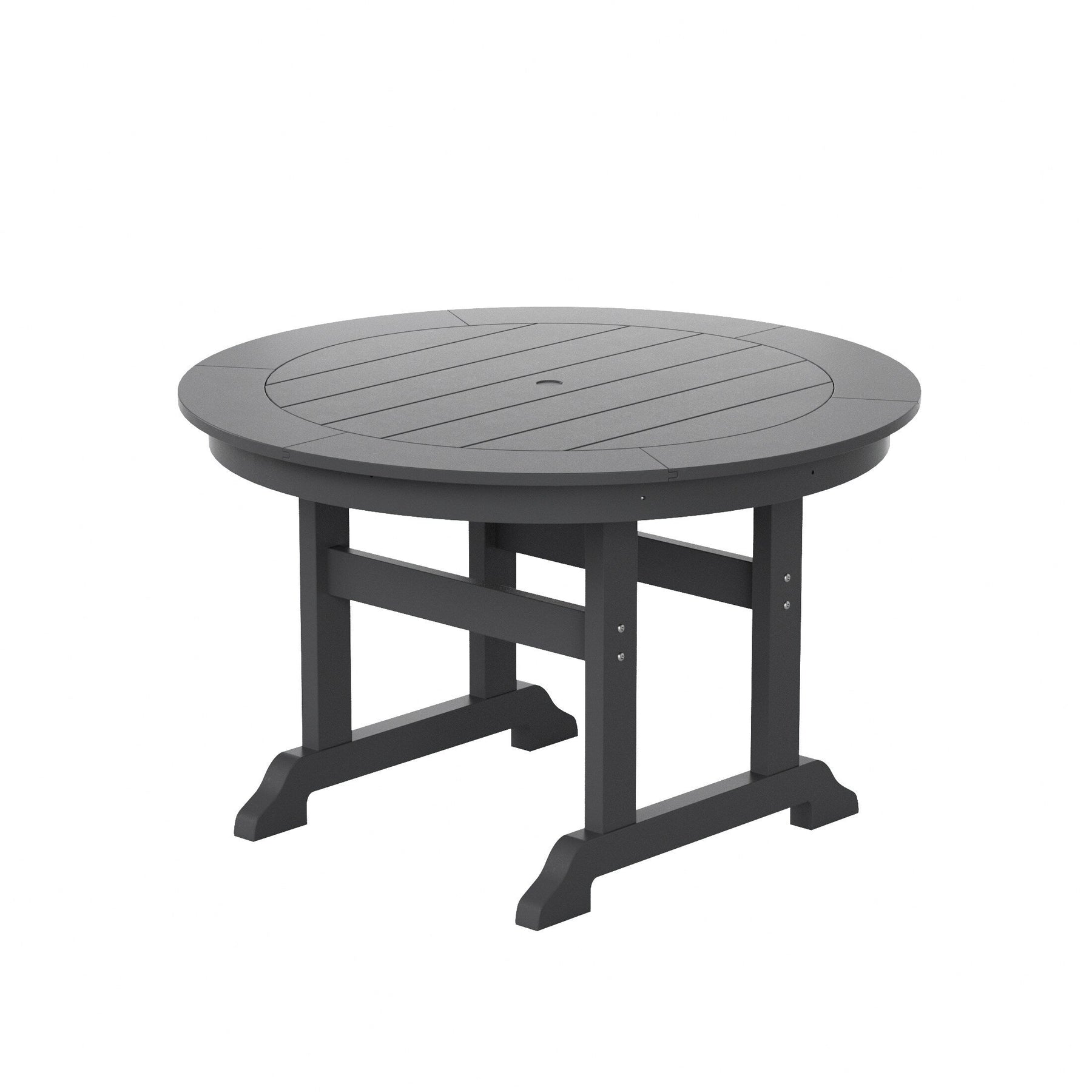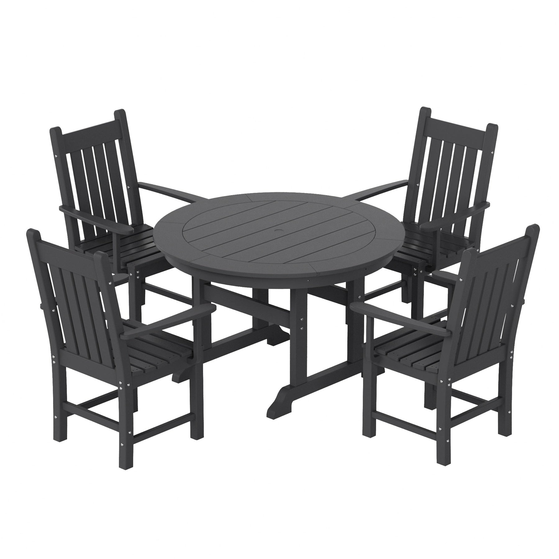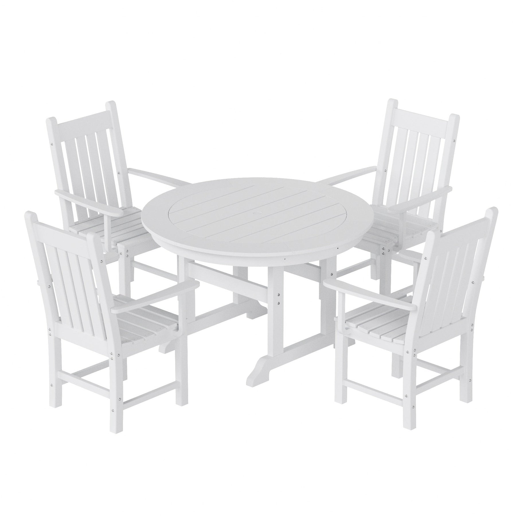 This traditional dining set brings friends and family together with its ample tabletop space, a durable frame, and attractive looks this set includes ?(1) Laguna Traditional Round Dining Table and (4) Armchairs. Our Laguna Round Dining Set with a heavy-duty construction made with our specially formulated HDPE and eco-friendly materials. Our HDPE is weather-resistant made to resist splits, cracks, rot, and peeling, for a lasting and attractive element you can enjoy for years to come. The sturdy frame features a slat-style tabletop for airflow not only trendy but functional. ?For added convenience, this table was made with a built-in umbrella hole (umbrella not included) to give you the option of shade cover from the blistering sun on a hot day. ?Whether you are entertaining guests or simply enjoying the outdoors this table will satisfy you for years to come.?