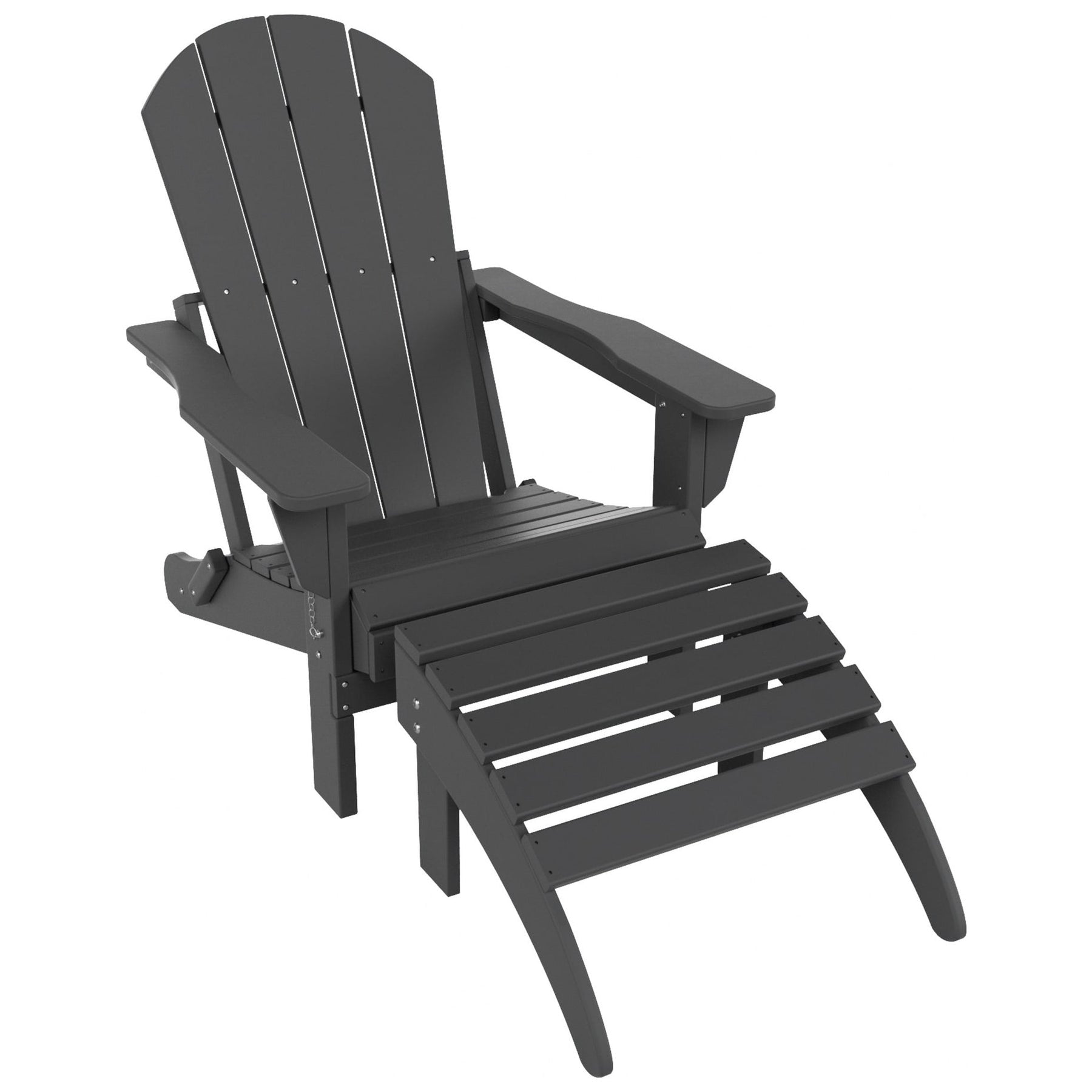 Relax with this beautiful folding Adirondack and ottoman set. Includes one (1) folding chair and one (1) ottoman - this set is sure to impress with an ergonomical design with comfortable wide arms and contoured seat and back with a reclined silhouette. Makes the perfect addition to any backyard or outdoor space.\n