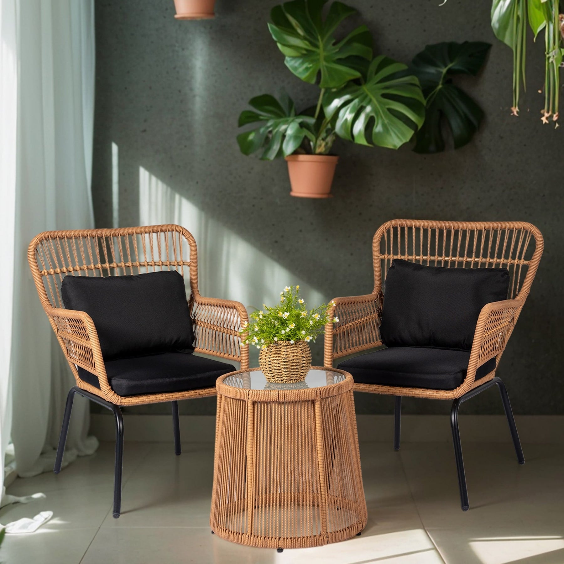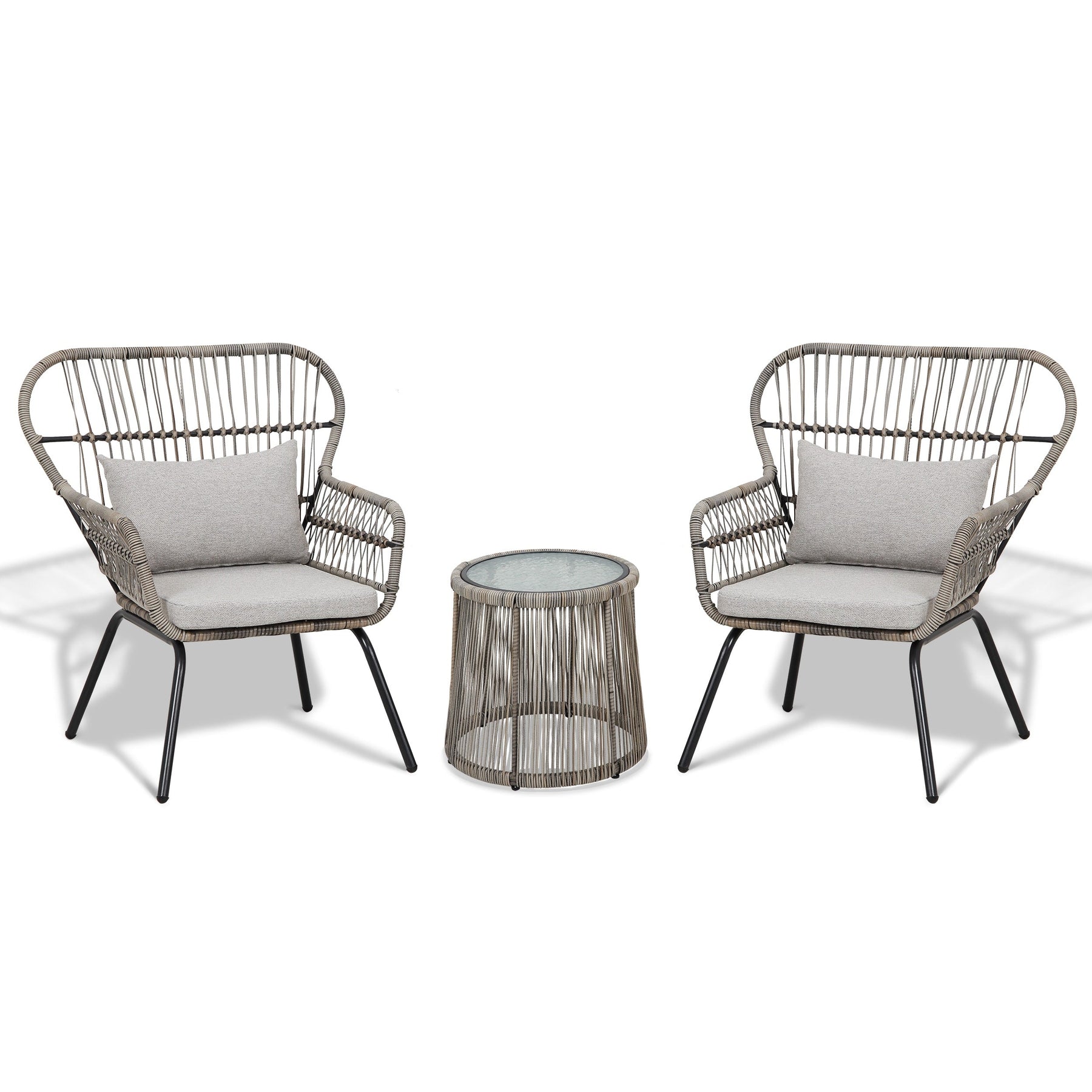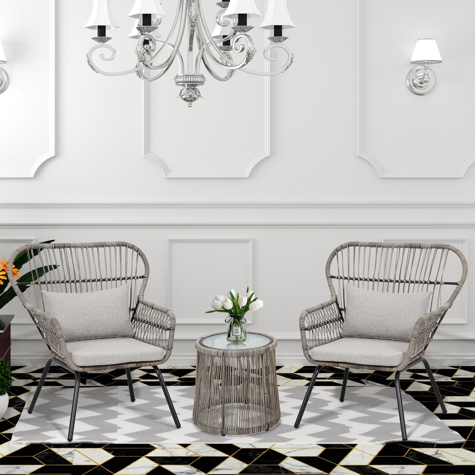 - 3 Piece Outdoor Wicker Conversation Bistro Set, All-Weather Rattan Furniture Patio Chairs Set with Table for Balcony, Garden Porch Backyard,