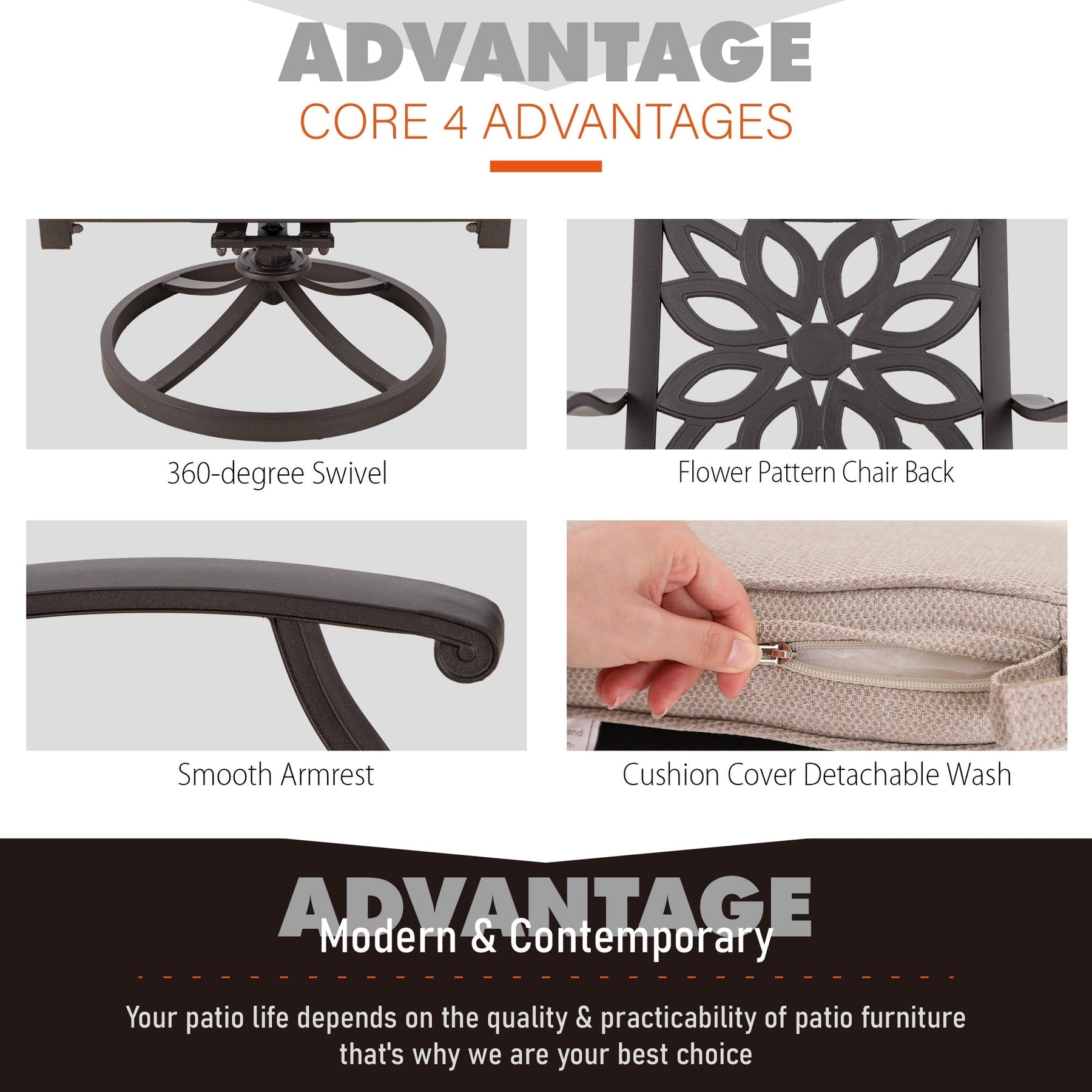 This cast aluminum patio dining set can be placed wherever you want in your home, you can put it outside without careful care, and it can be used for a long time. You can have afternoon tea with your family and even friends at this patio set, eat or even work, or read a book, it is very practical and can meet all your needs. It is the perfect embellishment for your home decoration.