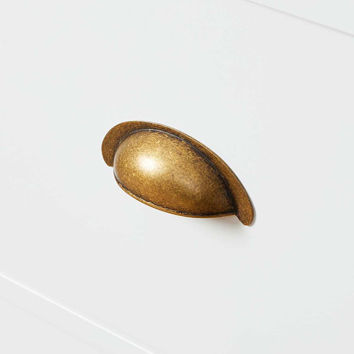 Introducing the Hastings Six Drawer - White/Natural, a versatile mix of classic farmhouse charm and practicality. With its light timber top and white drawers featuring brass-toned, shell-shaped handles, this dresser is ideal for main bedrooms, kids' rooms, or nurseries. Its compact design fits neatly under windows (please check measurements), offering lots of storage with six spacious drawers.