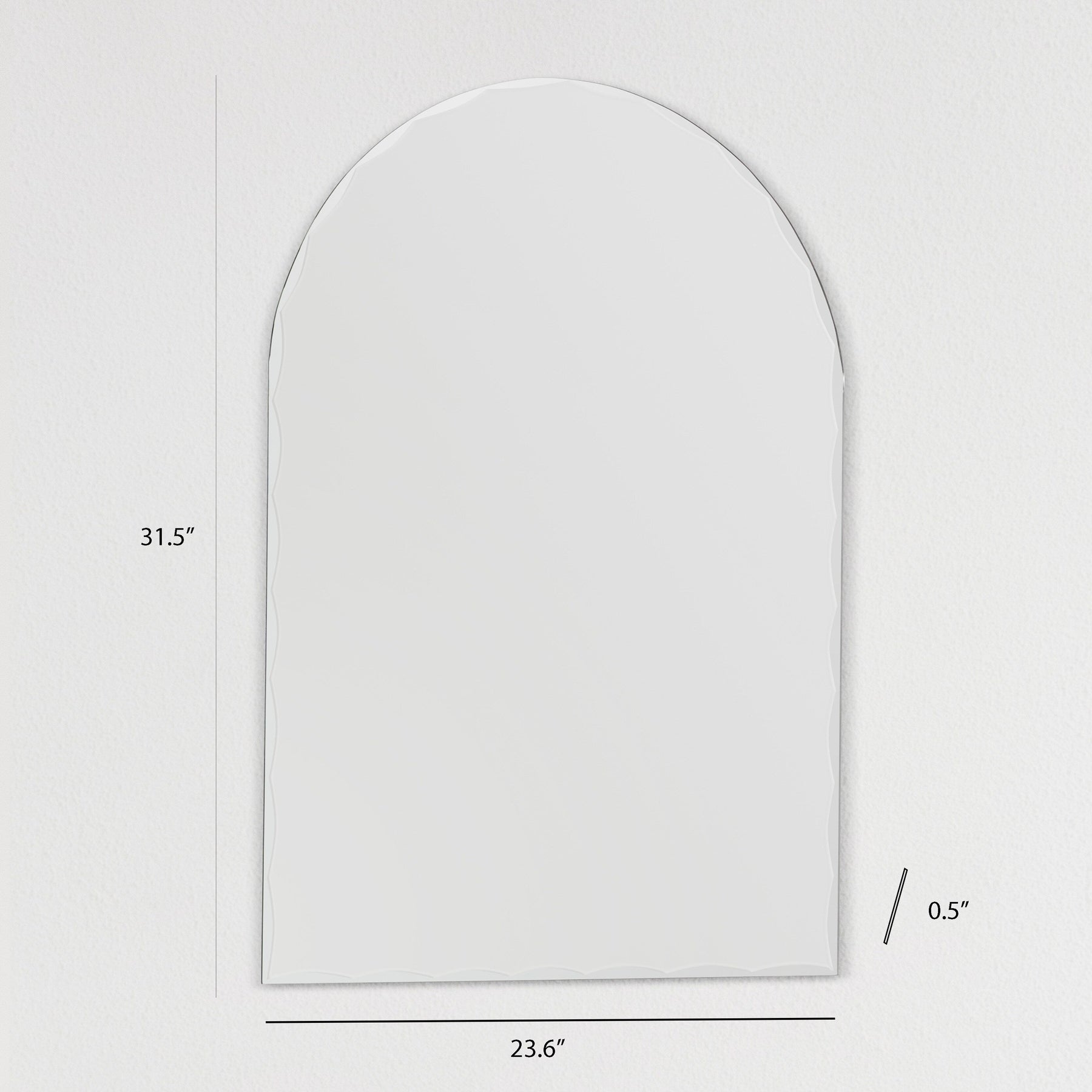 Upgrade your bathroom decor with the sleek and modern Rita Arch Frameless Vanity Mirror. The scallop beveled border adds a touch of elegance to this premium 5mm glass mirror, which has a protective coating to prevent tarnishing and corrosion in high-humidity areas. With invisible mounting hardware that keeps the mirror flush against the wall, this mirror is easy to install and hangs vertically only. Crafted with real silver for a sharper reflection, this mirror is distortion-free and made with thick, strong 3/16 float glass. Available in two sizes, Rita XL SSM3006L measures 23.6' x 39.5' while Rita SSM3006 measures 23.6' x 31.5'.