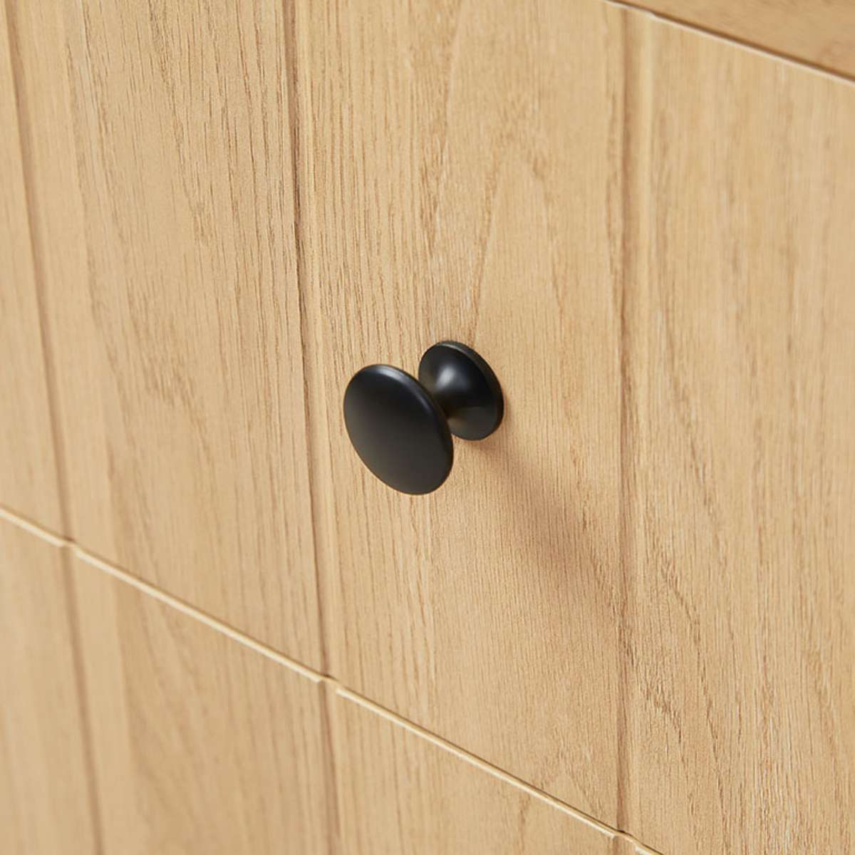 Enhance your bedroom with the timeless charm of Mocka's Portland Bedside Table. Featuring a natural wood-look finish, two sliding drawers with black metal knobs, and elegant vertical grooves, this piece suits a variety of spaces, from farmhouse to modern-style rooms. Practical and stylish, it’s perfect for storing essentials right by your bed.