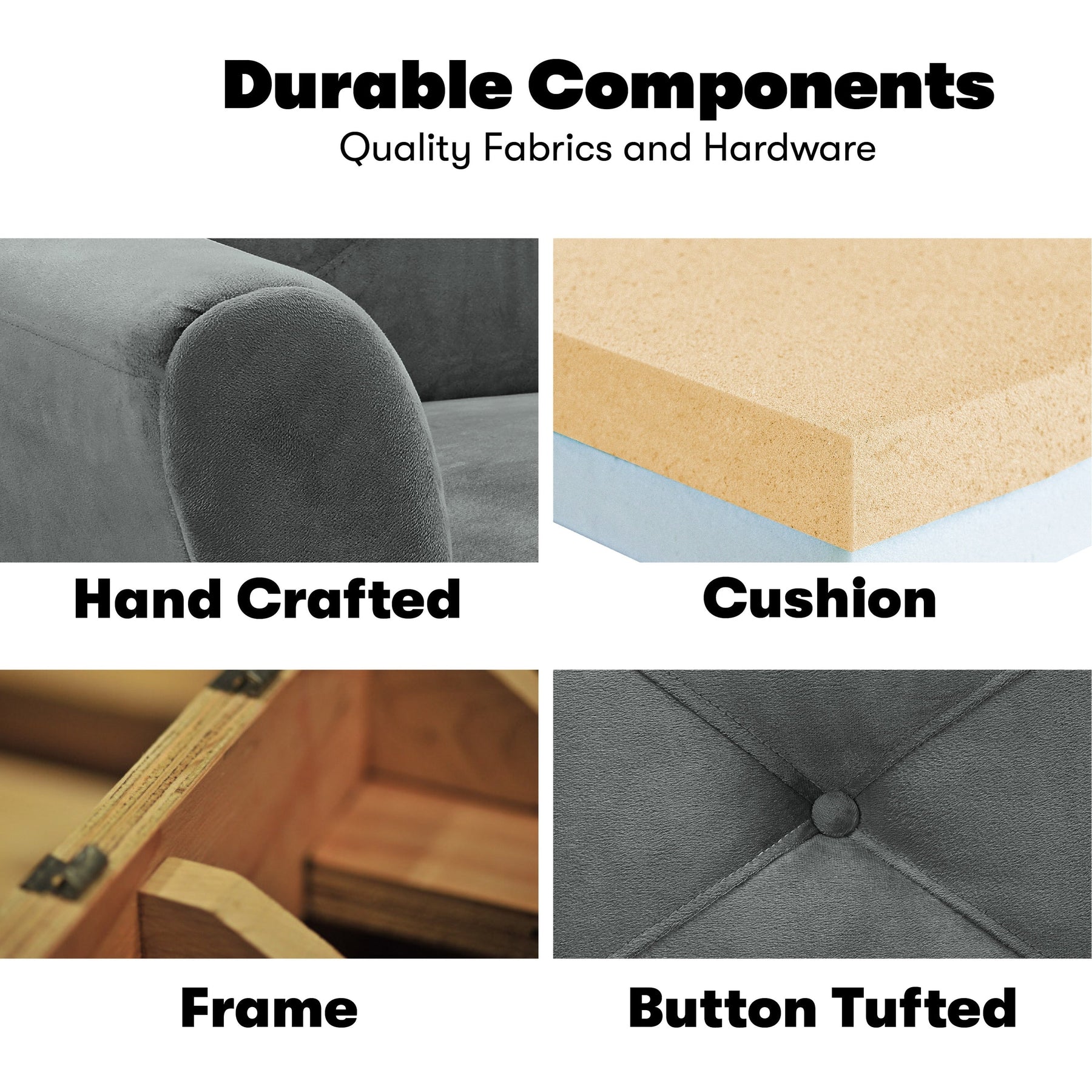 • Made of engineered woods, foam, and polyester