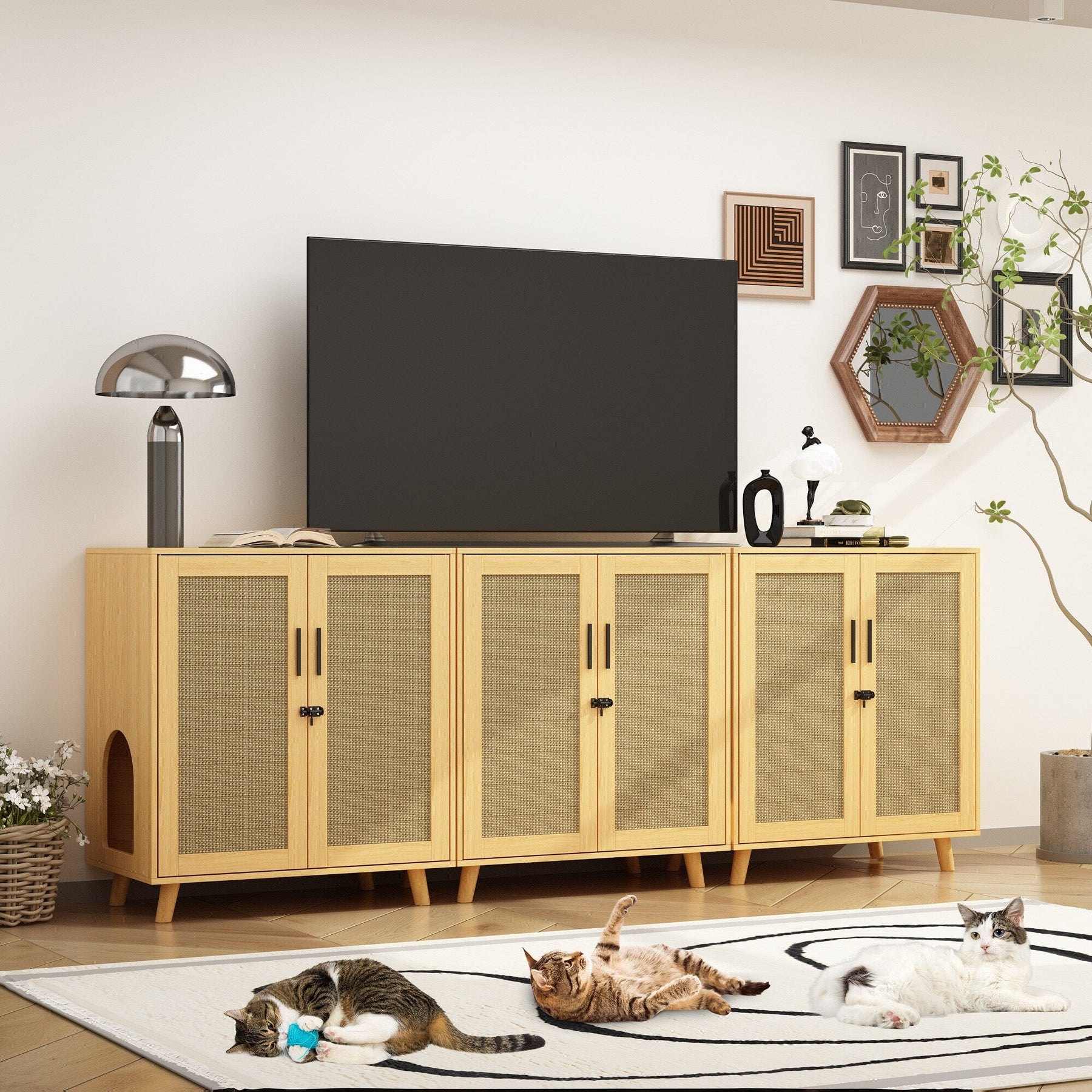 【4-in-1 Multi-Functional Cat House:】This 2-door rattan cabinet serves as a versatile cat house that meets various needs. It not only conceals your cat's litter box but also provides a private and comfortable space for your furry friend. Additionally, it functions as a storage cabinet for pet snacks and toys, as well as a practical side table bathroom cabinet or nightstand that seamlessly blends with your home decor.