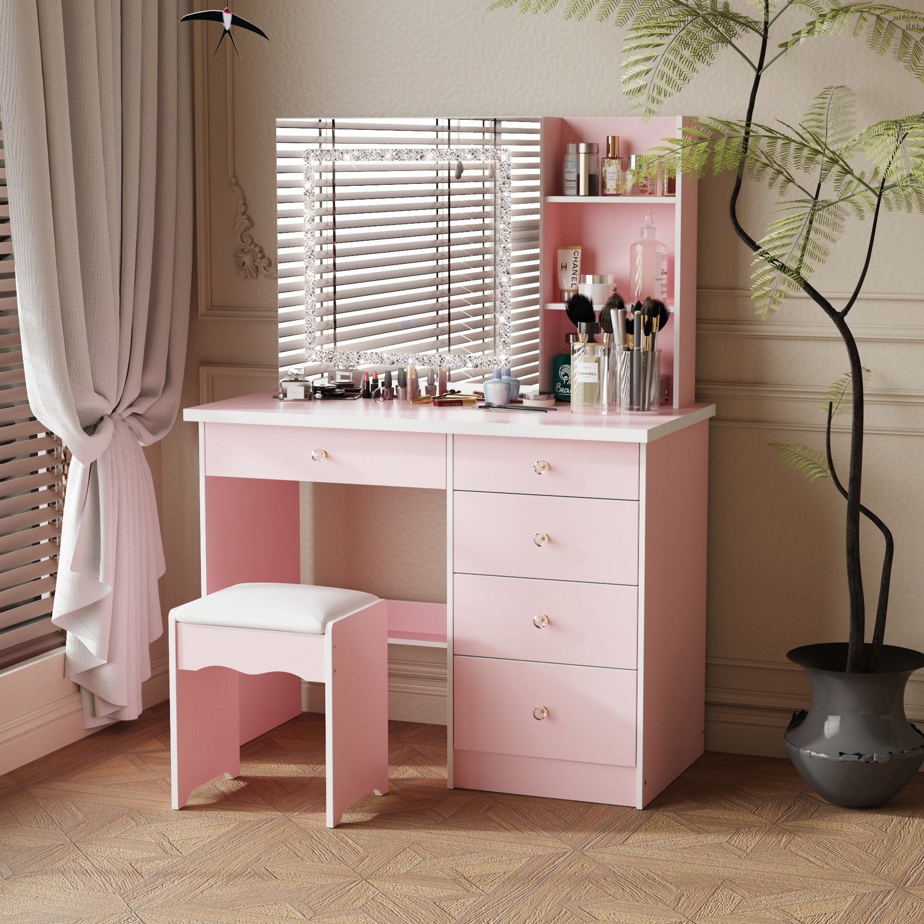 Elevate your beauty routine with our spacious and stylish Makeup Vanity Set with Stool and Mirror. Crafted from environmentally friendly E1 grade particleboard, this vanity is built to last and perfect for any room in your home. Enjoy three light modes to ensure your makeup colors and skin tones look flawless in any lighting, while the large sliding mirror provides a clear and detailed view. With five drawers and hidden/open shelves, there's ample storage space for all of your beauty essentials. Upgrade your daily routine with this versatile and chic vanity set.( If you have any questions, please contact us:ostimechee@gmail.com )