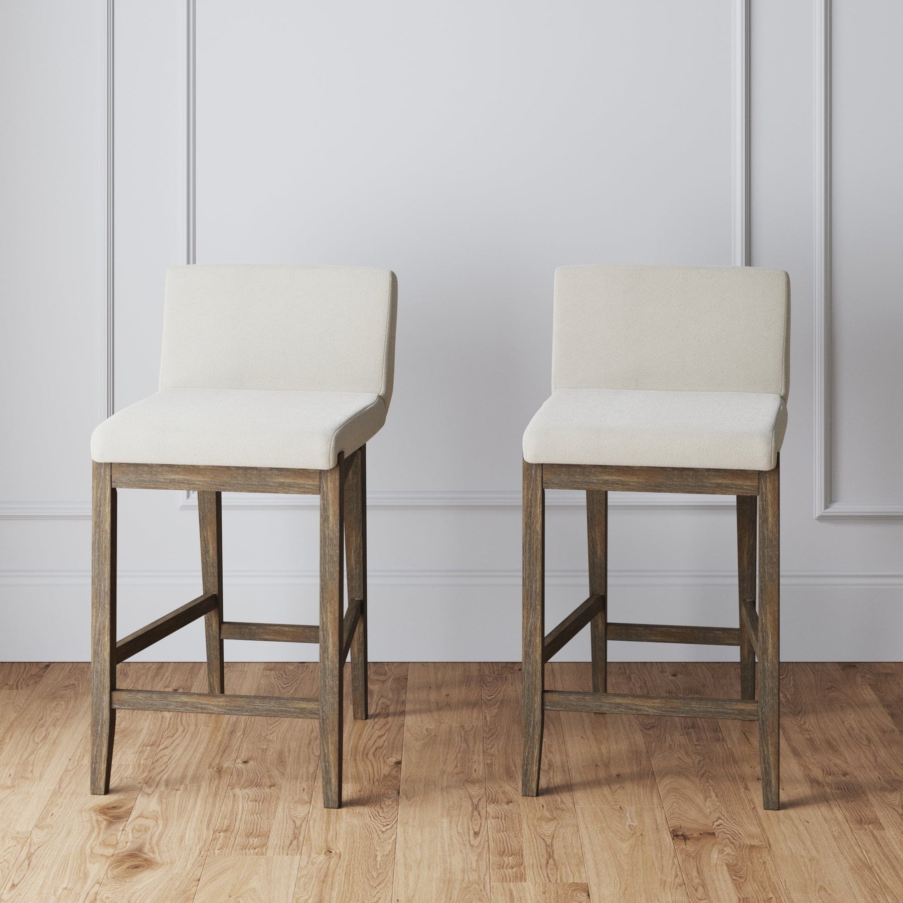 - Gracie features a brushed wood wash on its solid legs and boucle fabric or faux leather upholstery, making it a suitable addition to your modern or farmhouse style kitchen.