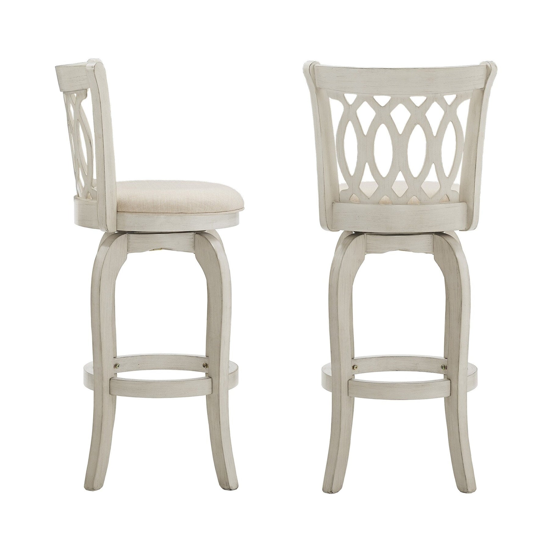 Constructed of durable rubberwood, this Scroll Back Linen Swivel Stool displays a beautiful, classic style and offers comfortable support for everyday dining. A rich wood finish completes the chair's frame, while a footrest and upholstered seat provide improved comfort for daily use. The swivel function of this stool provides advanced mobility and makes it easy to have a casual conversation with friends and family during mealtime. The solid Scroll Back design adds additional cushion and support, so you can look forward to sitting in this seat.