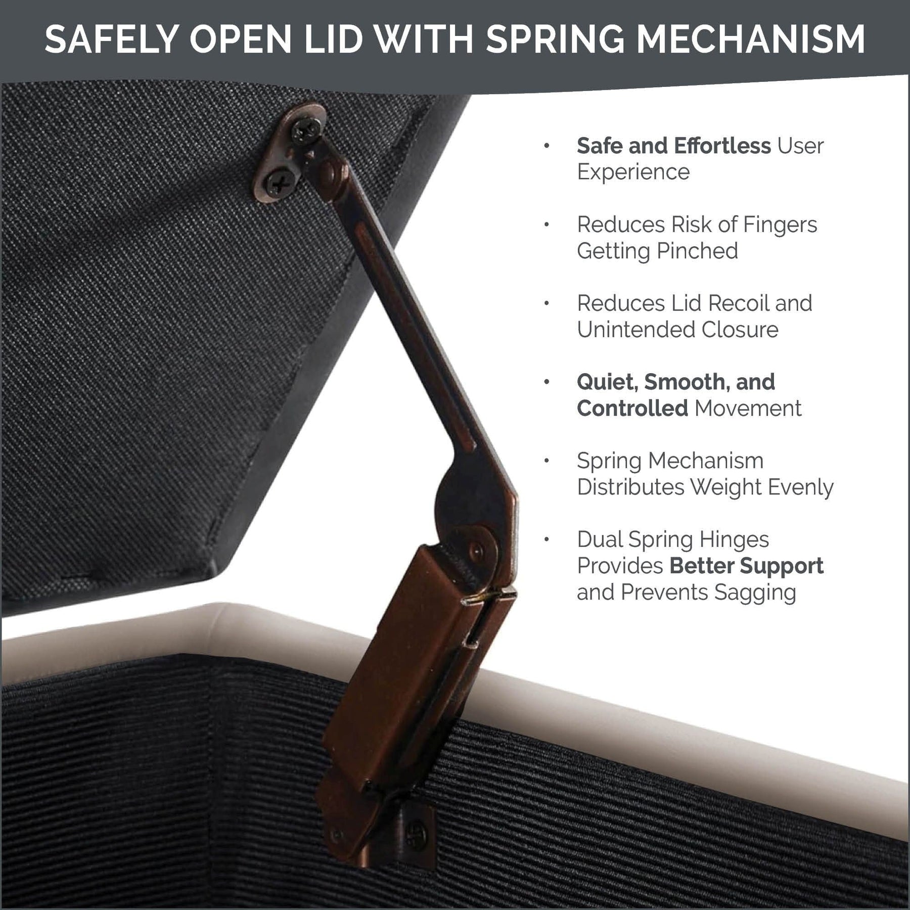 - Quality construction with padded lid and sides, solid wood legs and quiet, smooth and controlled movement using spring hinges