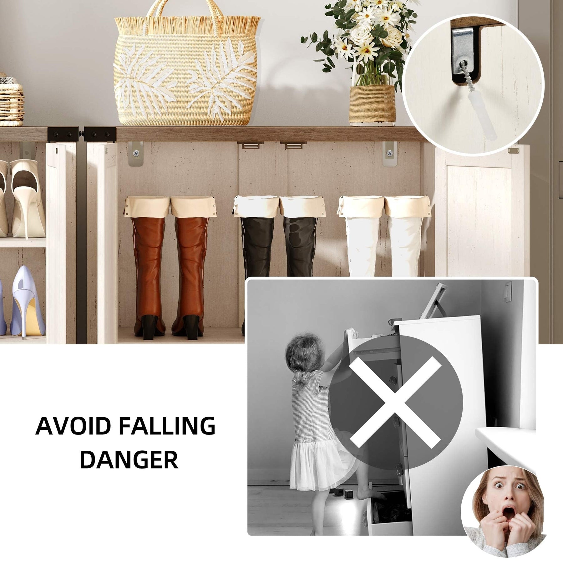 Step into organization with our spacious Shoe Cabinet. With 5 shelves that can accommodate 15-20 pairs of shoes, and a handy top for small items, it's a must-have for any home. The cabinet's exquisite X pattern adds a touch of farmhouse charm, while the adjustable 1st and 3rd shelves accommodate all types of footwear. Crafted from durable MDF with sturdy wooden legs, it's designed for stability and longevity. Remember to install the included anti-tip kit for safety.