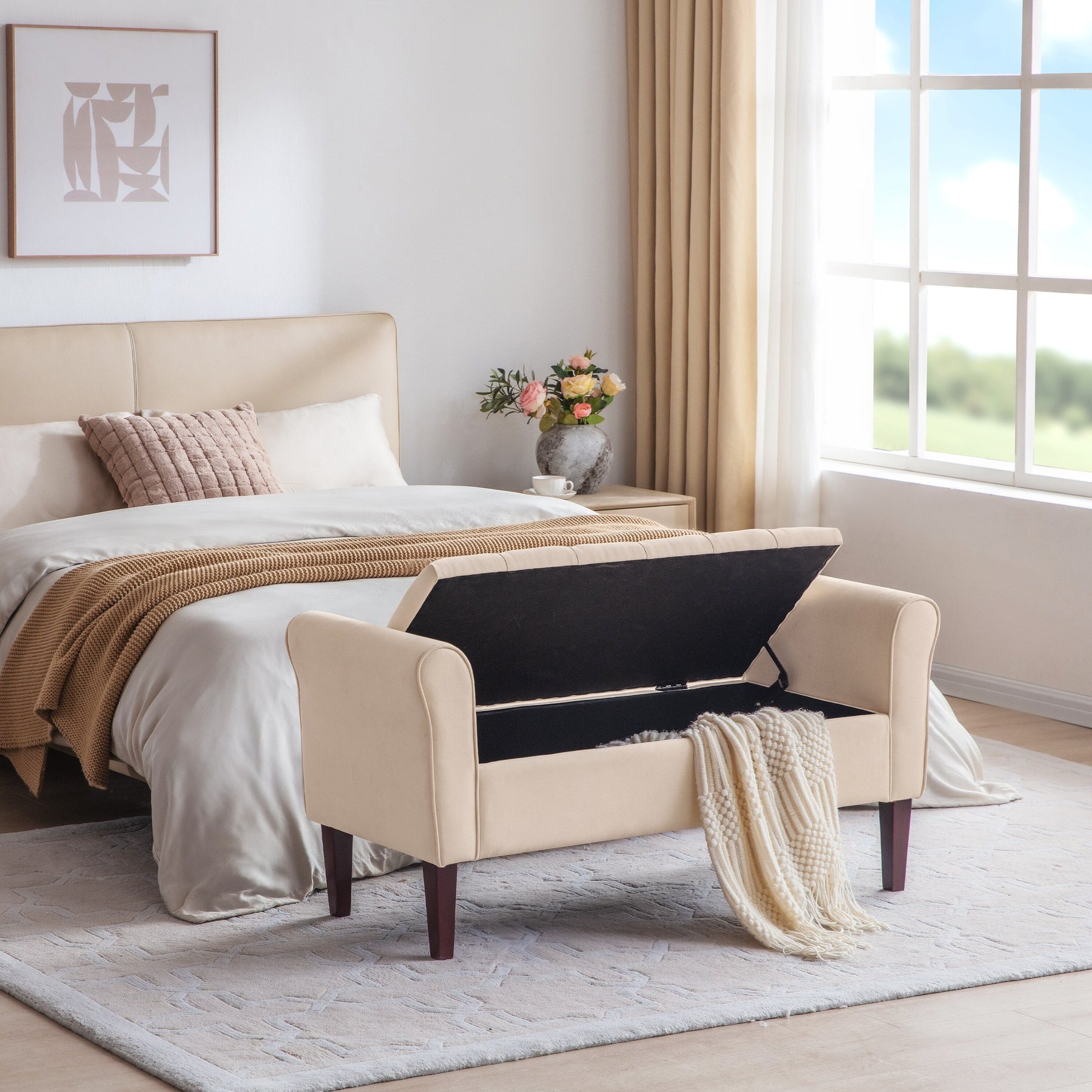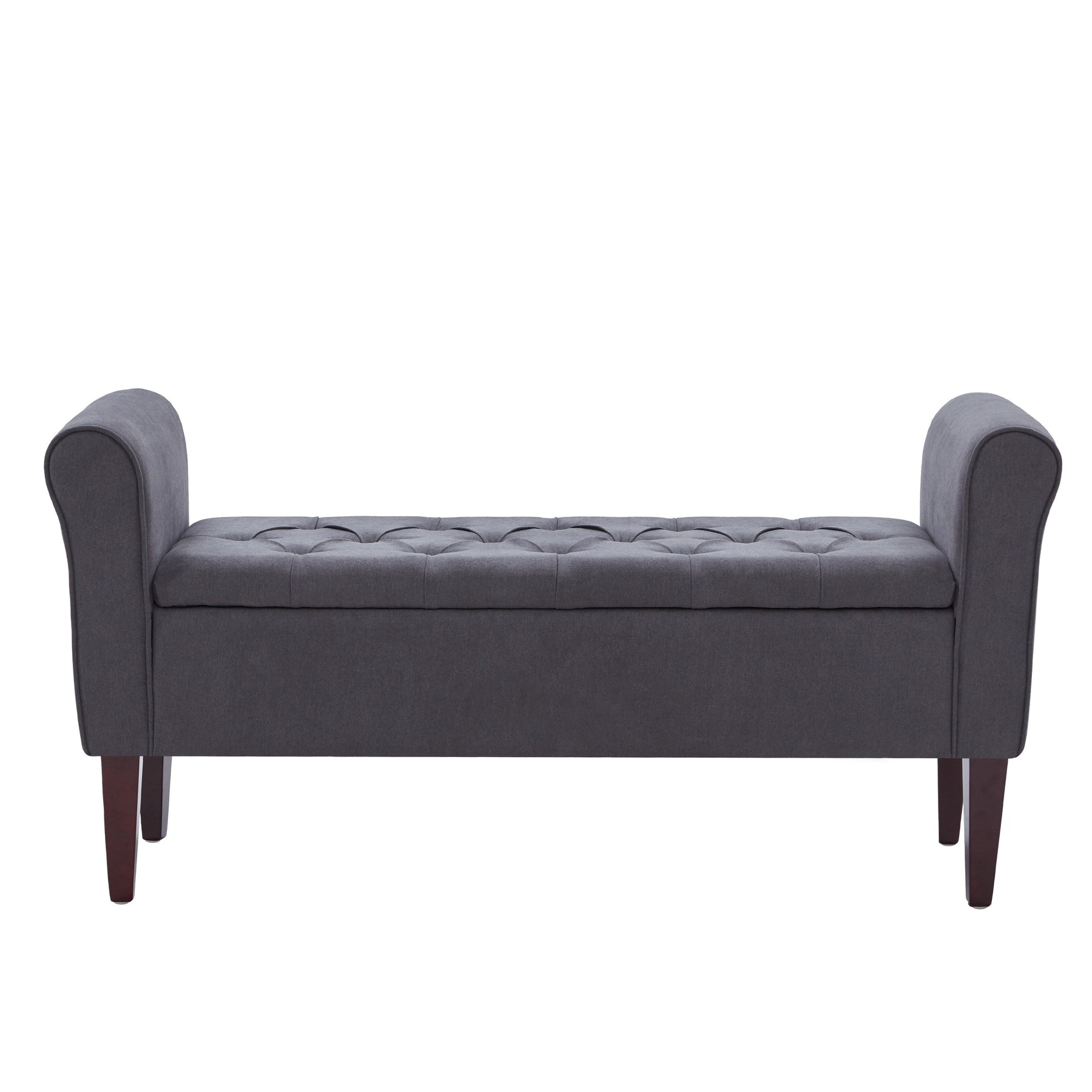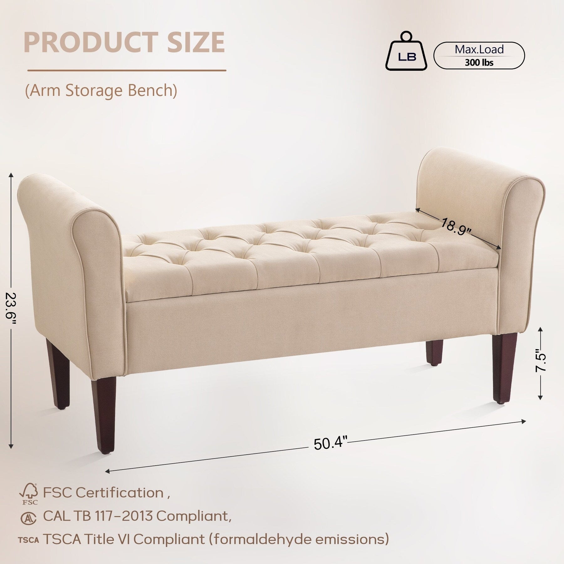 This stylish tufted storage bench brings surprises and happiness to your life! You can place it in the bedroom or living room, not only as a piece of furniture but also to improve the overall design of the home, ideal for your family and pets' uses. The window storage bench features simple rolled arms for a luxurious look, put a comfortable pillow along the top and it becomes a cute little couch.The bench is upholstered in high-quality polyester fabric, providing a soft and comfortable seating experience. The tufted flip-top design adds a touch of sophistication, while also allowing easy access to the ample storage space inside. Supported by sturdy wooden legs, it not only looks great but also ensures durability and stability.