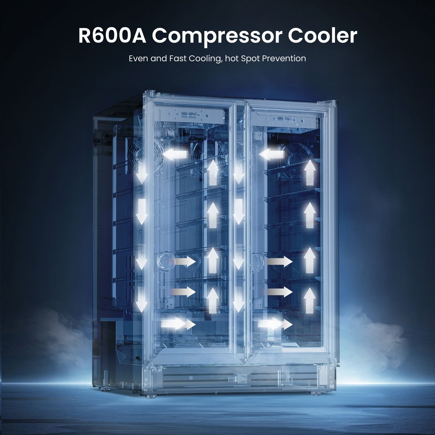 • Eco-Friendly and Efficient Cooling: Featuring R600a refrigerant and DOE certification, the Yeego Wine Beverage Cooler offers fast, even cooling while saving energy. The front-venting fan system enhances air circulation and heat dissipation, while the activated carbon filter removes odors, maintaining a fresh environment inside this wine beverage refrigerator.