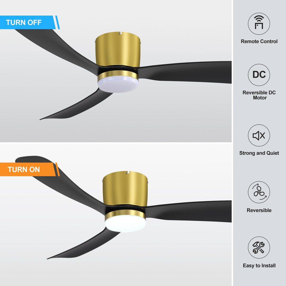 The 52' ceiling fan features an energy-saving 6-speed, reversible DC motor housed in a clean body with architectural blade arms supporting 3 blades, 3000K LED Light, and is easily controlled with the included remote control. Super quiet DC motor runs 70% more efficient than traditional AC fans.