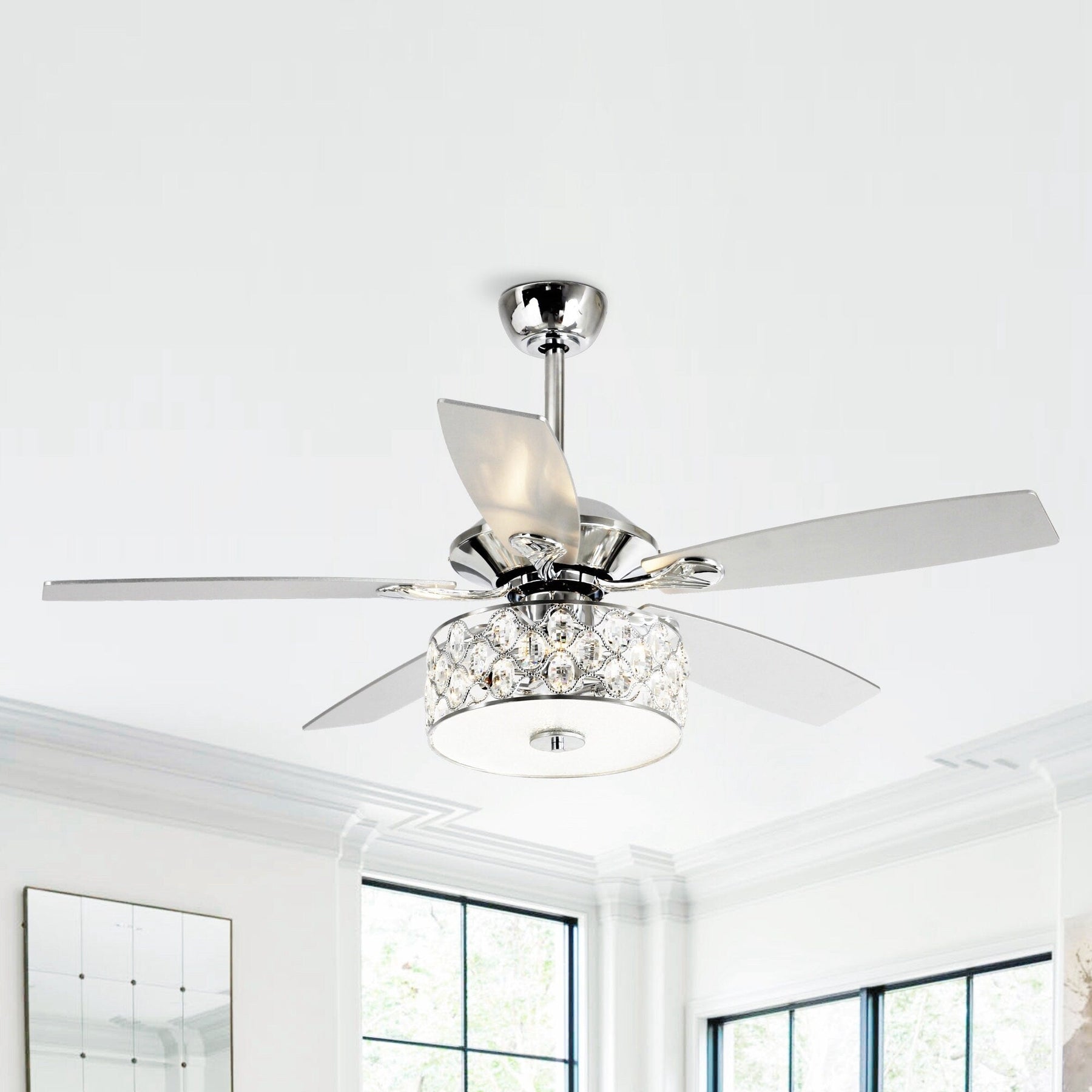 Bring a touch of modern sophistication to your living space with this 52' Modern 4-Light Chandelier Crystal Ceiling Fan with Remote. The chrome-finished metal frame and silver-stained wooden blades provide a sleek and updated look that is perfect for any room in your home. Enjoy the benefits of a reversible motor with three speeds that can be used in the winter to save energy. A handheld remote makes it easy to turn the light on and off and adjust the fan speed to your liking.