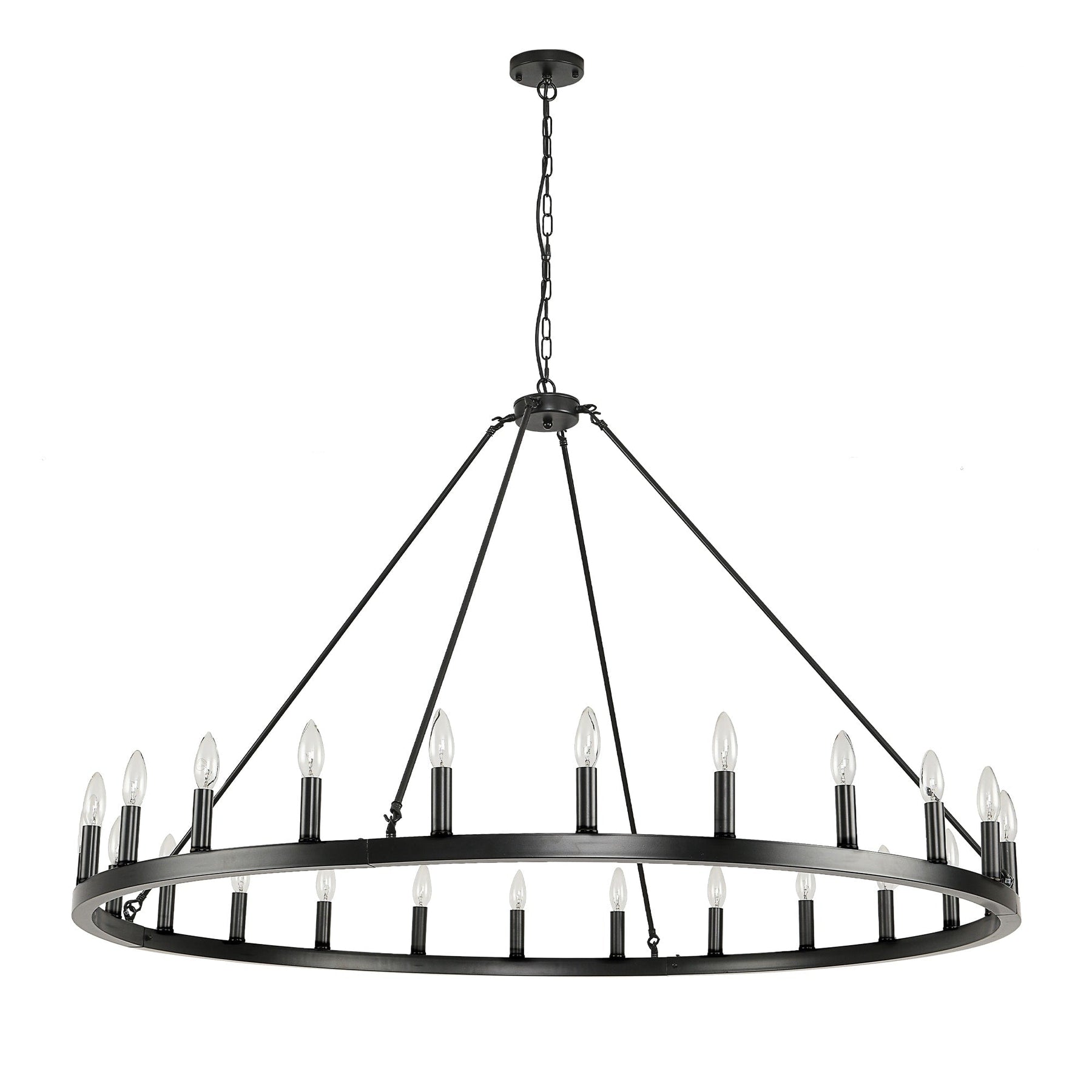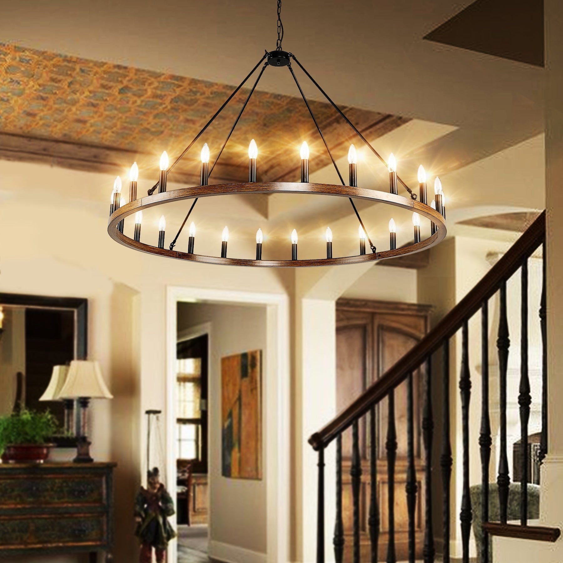 Add a touch of modern farmhouse style to your home 54-inch Round Wagon Wheel 24-light Chandelier. Made of sturdy metal and available in multiple finishes, this chandelier boasts a charming wagon wheel design that is sure to impress. With 24 bulbs and an ample size, this fixture provides plenty of light for larger rooms and is perfect for creating a cozy atmosphere in any space.