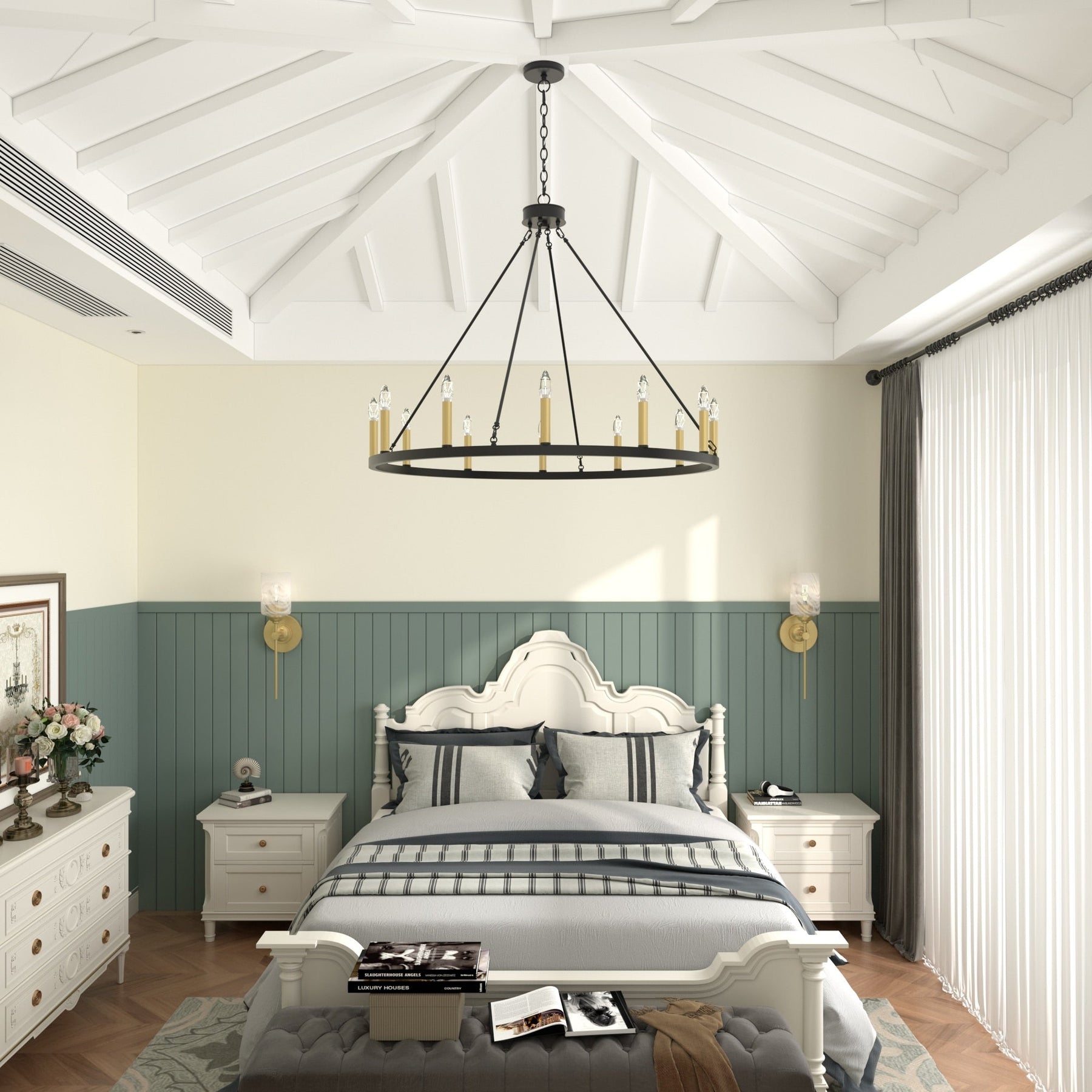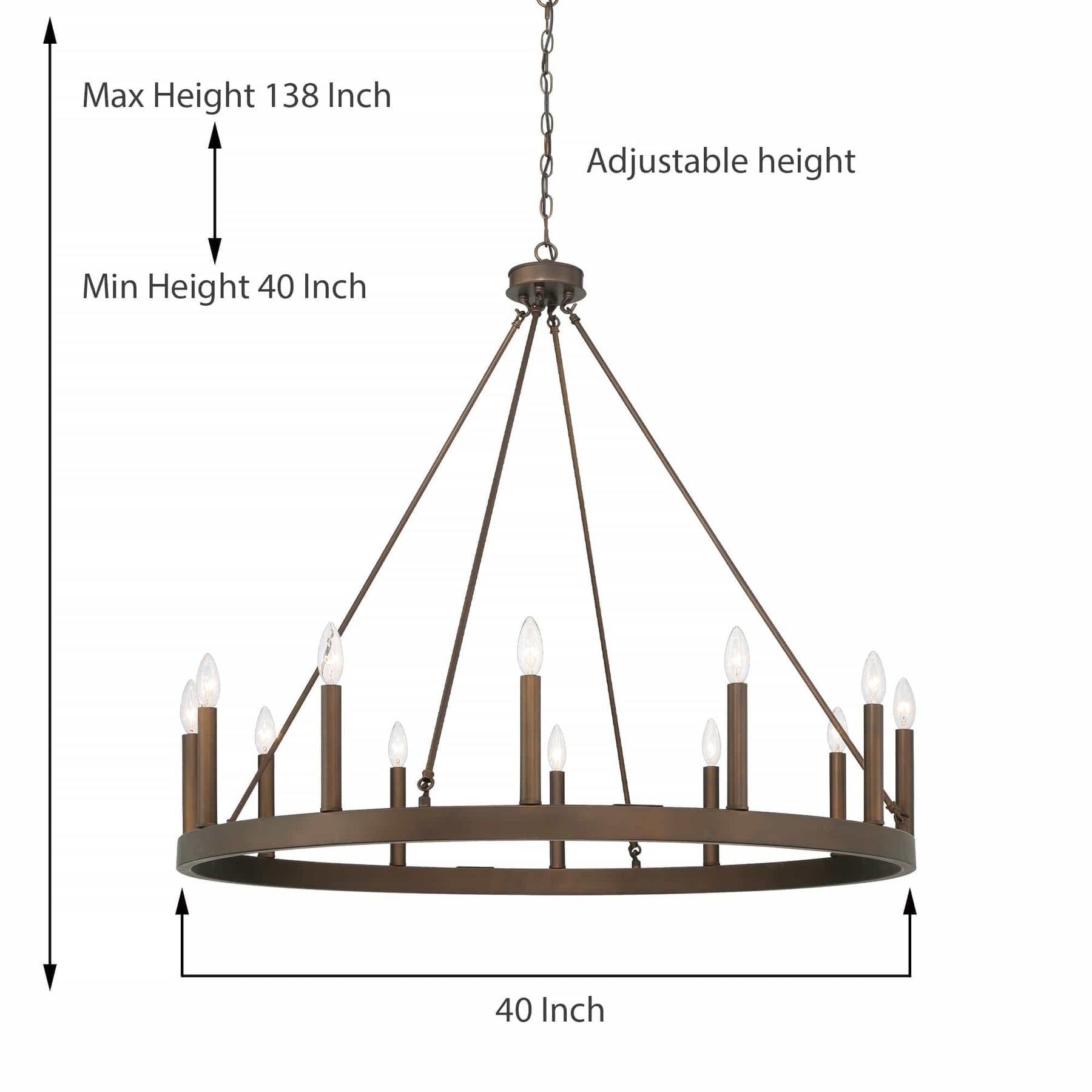Add a touch of modern farmhouse style to your home with the Wagon Wheel Chandelier. Crafted of premium steel and finished in various color for fitting various style like modern farmhouse, french country, and coastal. With a large size in 40'', this candle chandelier is perfect for living rooms, foyers, staircases, hallways, dining rooms, and bedrooms. Comes with 96'' long chain, the modern farmhouse chandelier height is adjustable from 40' to 138', ideal for normal and high ceiling, and sloped ceiling also compatible as that gives you versatile options for placement. With 12 candle-style holders (candelabra bulbs sold separately) are exposed, so they can give off a boost of brightness and light.