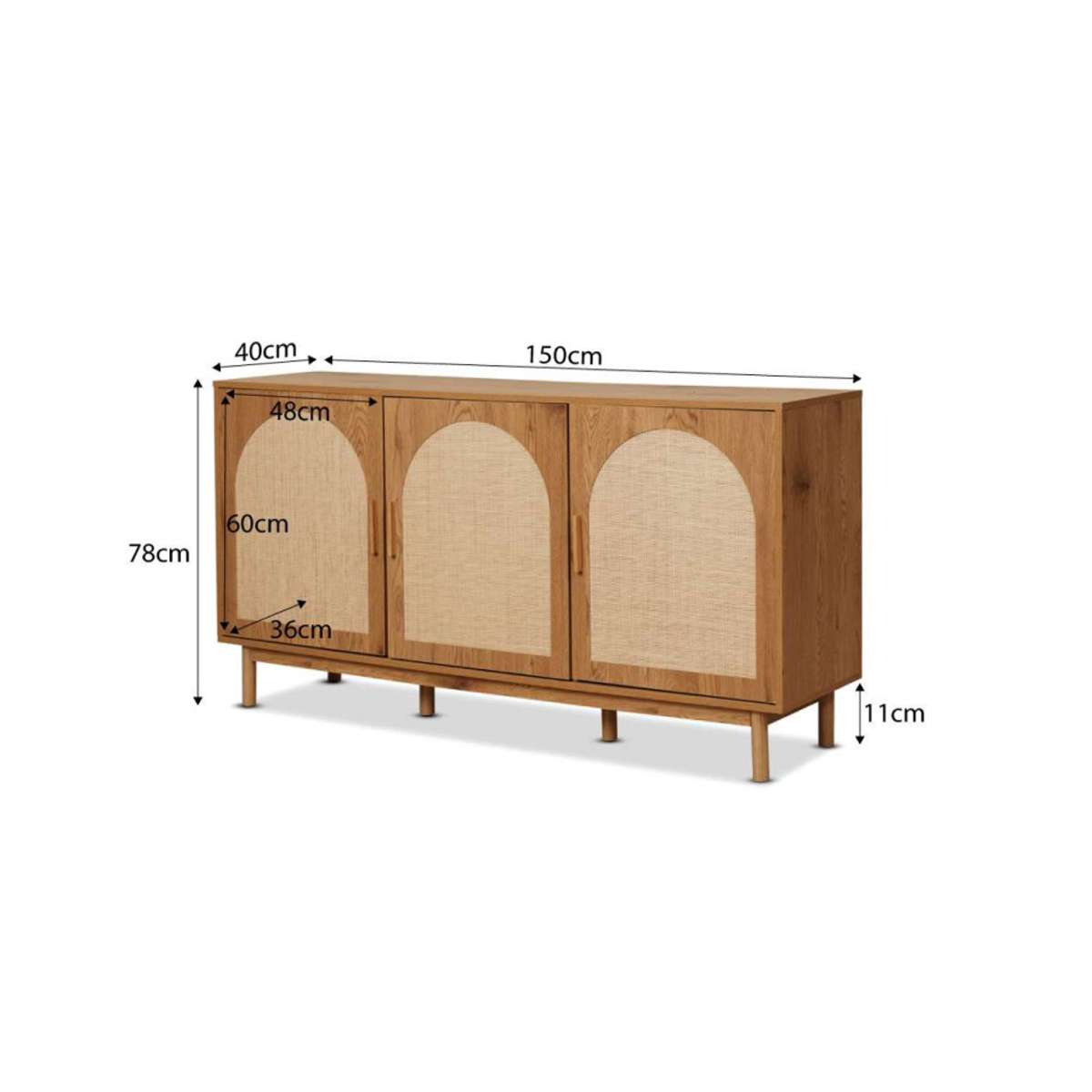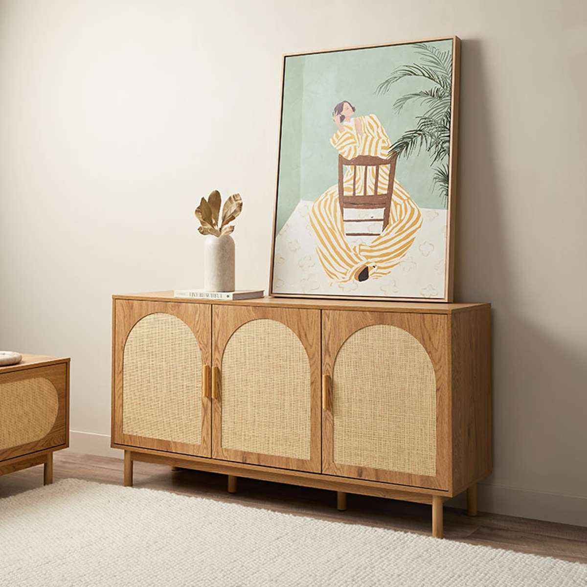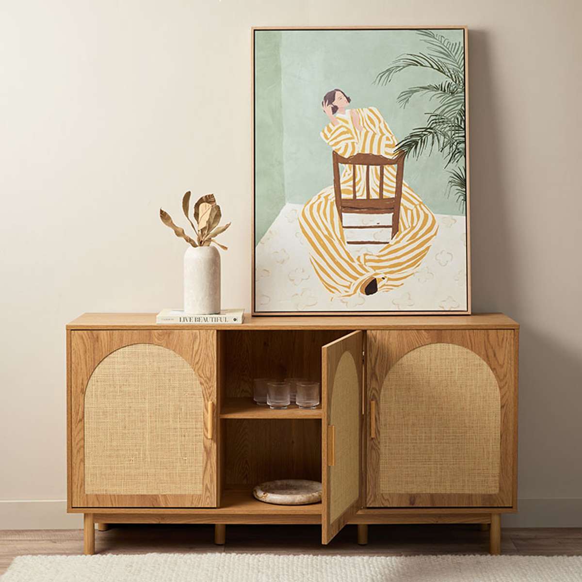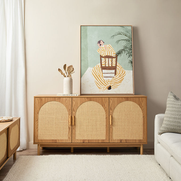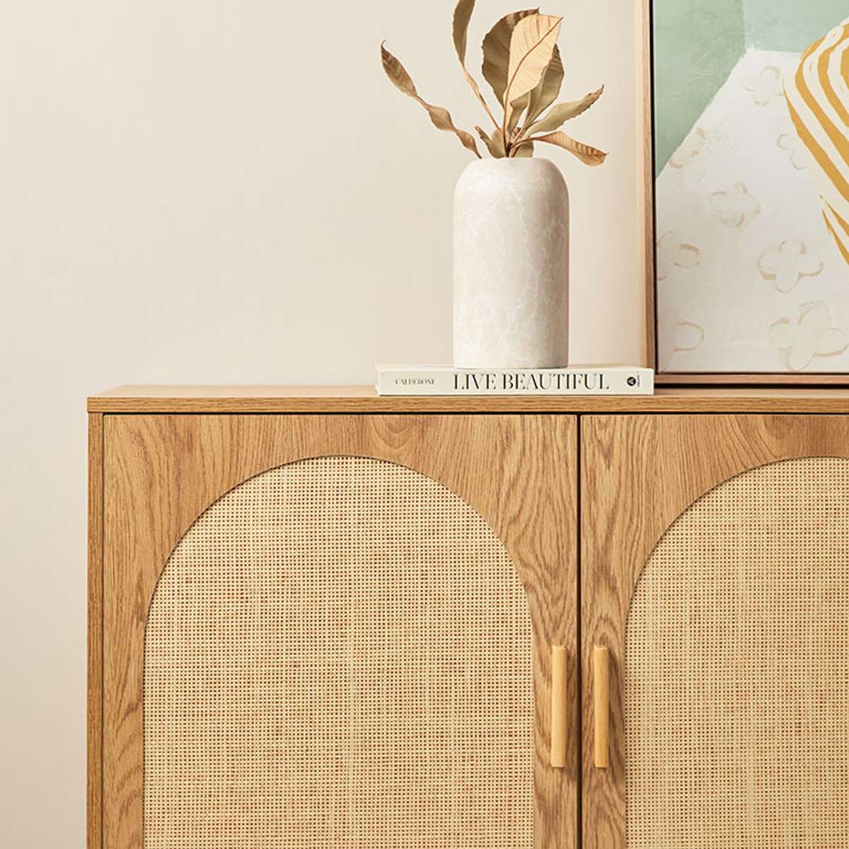 The Canyon Buffet is a beautiful blend of natural design and functional storage. The wood grain adds a warm and organic look to your home, while the arched rattan-look panels on the cupboard doors add a stylish, on-trend touch to the overall design.