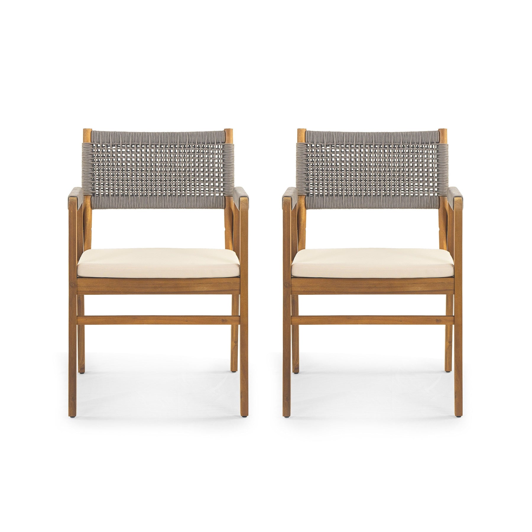 Upgrade your outdoor space with this stylish acacia wood furniture set. The set includes two chairs with comfortable rope-woven backrests and a matching acacia wood bistro table with a sleek teak finish. The durable, weather-resistant design is perfect for long-lasting use. Easy to assemble with tools included. Chair dimensions: 21.50' W x 21.50' D x 32.75' H. Table dimensions: 31.50' W x 31.50' D x 30.00' H.