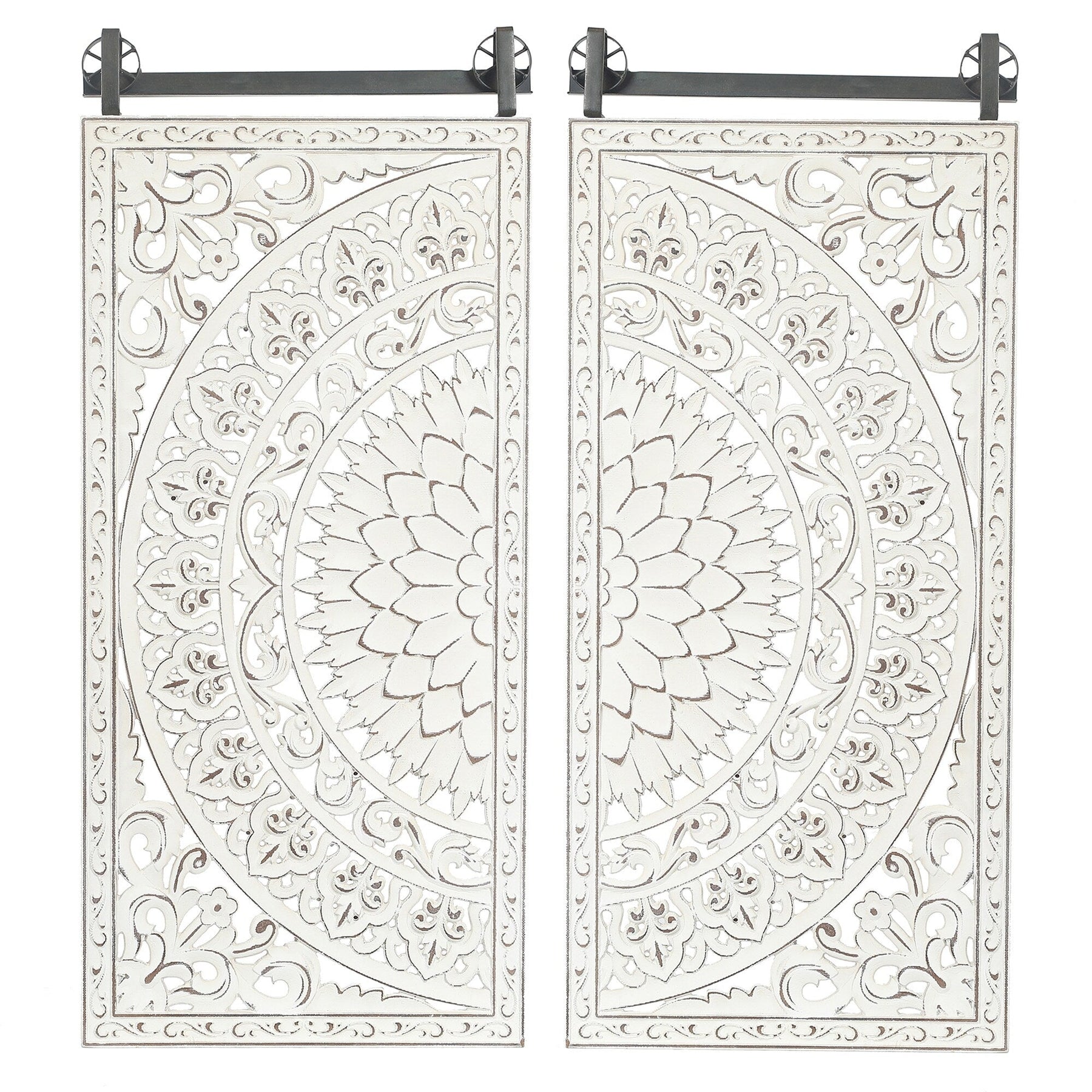 Looking to add some freshness, charm, and romance to your home decor? Look no further than this gorgeous 2-piece hand-carved floral-patterned wall decor set. Each piece is lovingly crafted from high-quality manufactured wood, with a beautiful carved flower design and raised details in soft ivory white with brown highlights for added depth and vintage appeal. The panels are attached to a sturdy weathered black iron bar, giving the set a modern farmhouse feel. Easy to mount with two metal D-ring brackets, this stunning wall art is sure to catch the eye and complement any interior design. Don't settle for a boring empty wall - give it the lift it deserves with this beautiful floral wall decoration.