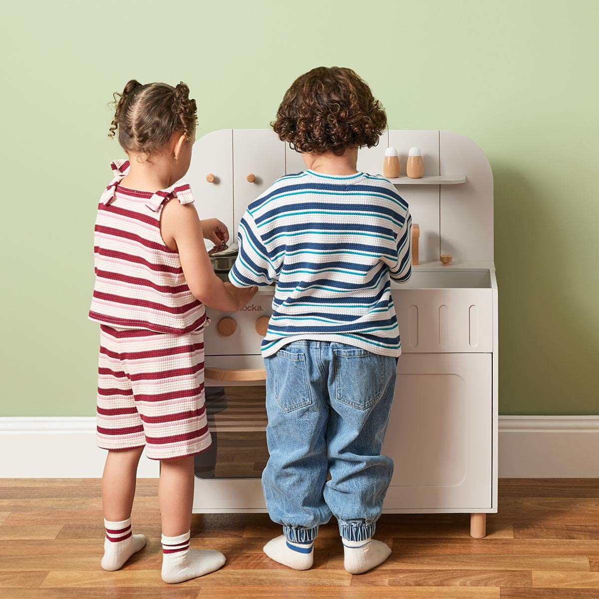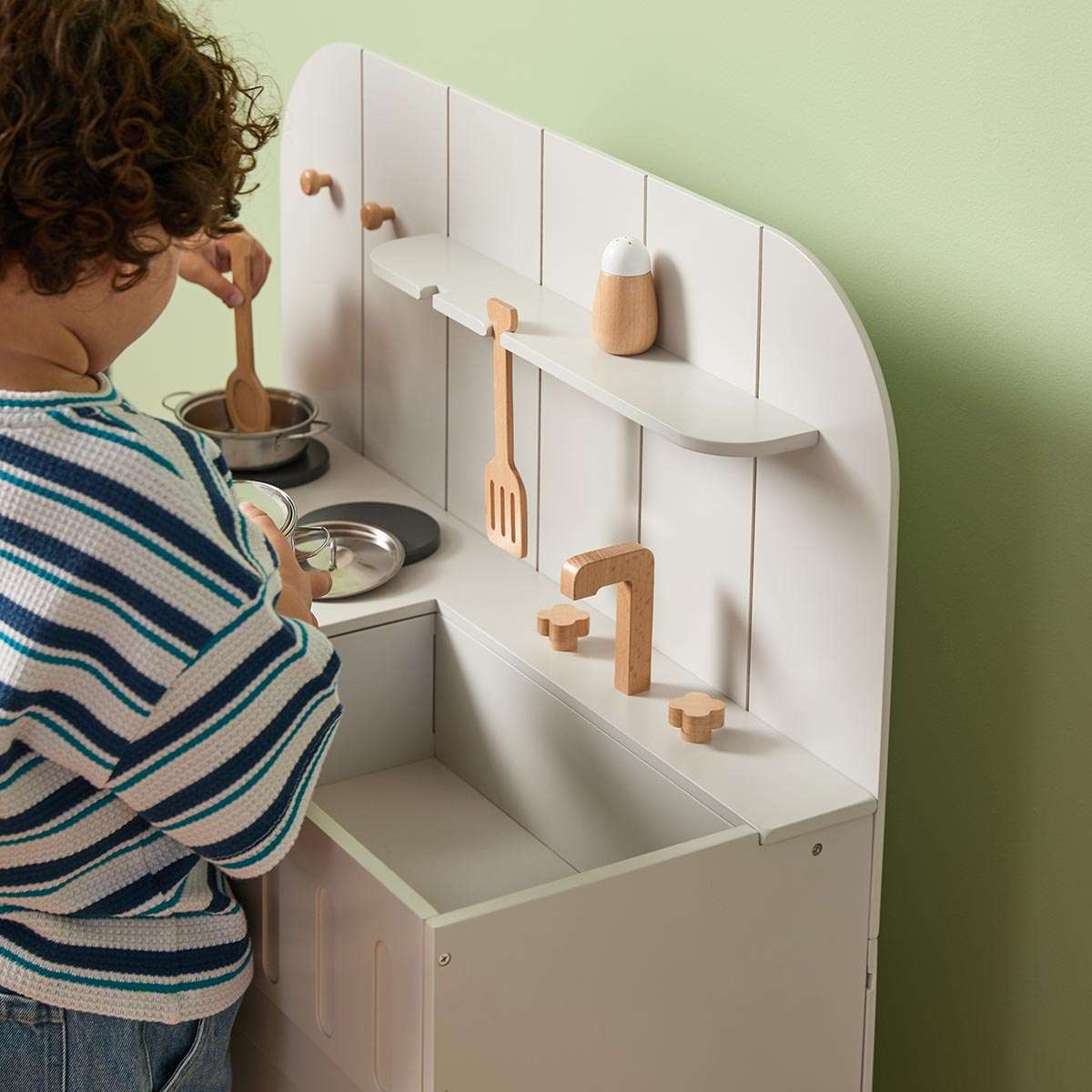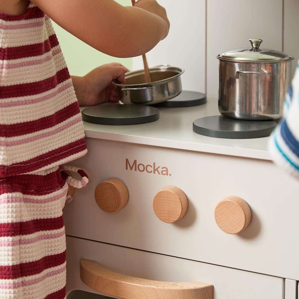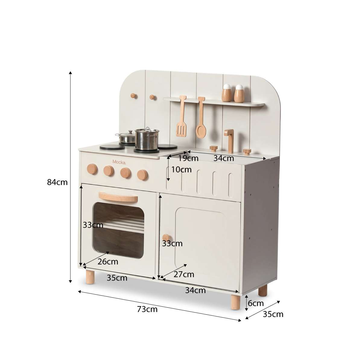 Bring farmhouse charm to your child’s playtime with the Mocka Farmhouse Kitchen. Featuring a putty beige finish, natural pinewood accents, and an on-trend apron sink, this mini kitchen is perfect for sparking your child's imagination. Complete with utensils, steel pots, and tidy storage, it’s both practical for playrooms or bedrooms, and endless fun for your little chef.