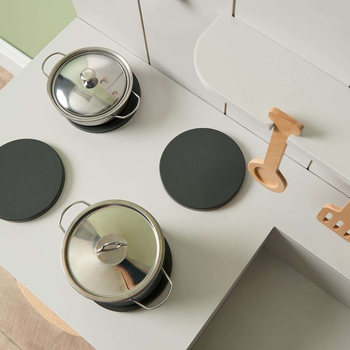 The kitchen includes two utensils, salt and pepper shakers, and steel pots. These accessories encourage imaginative play, while the oven and cupboard offer plenty of storage for toys and kitchen essentials.