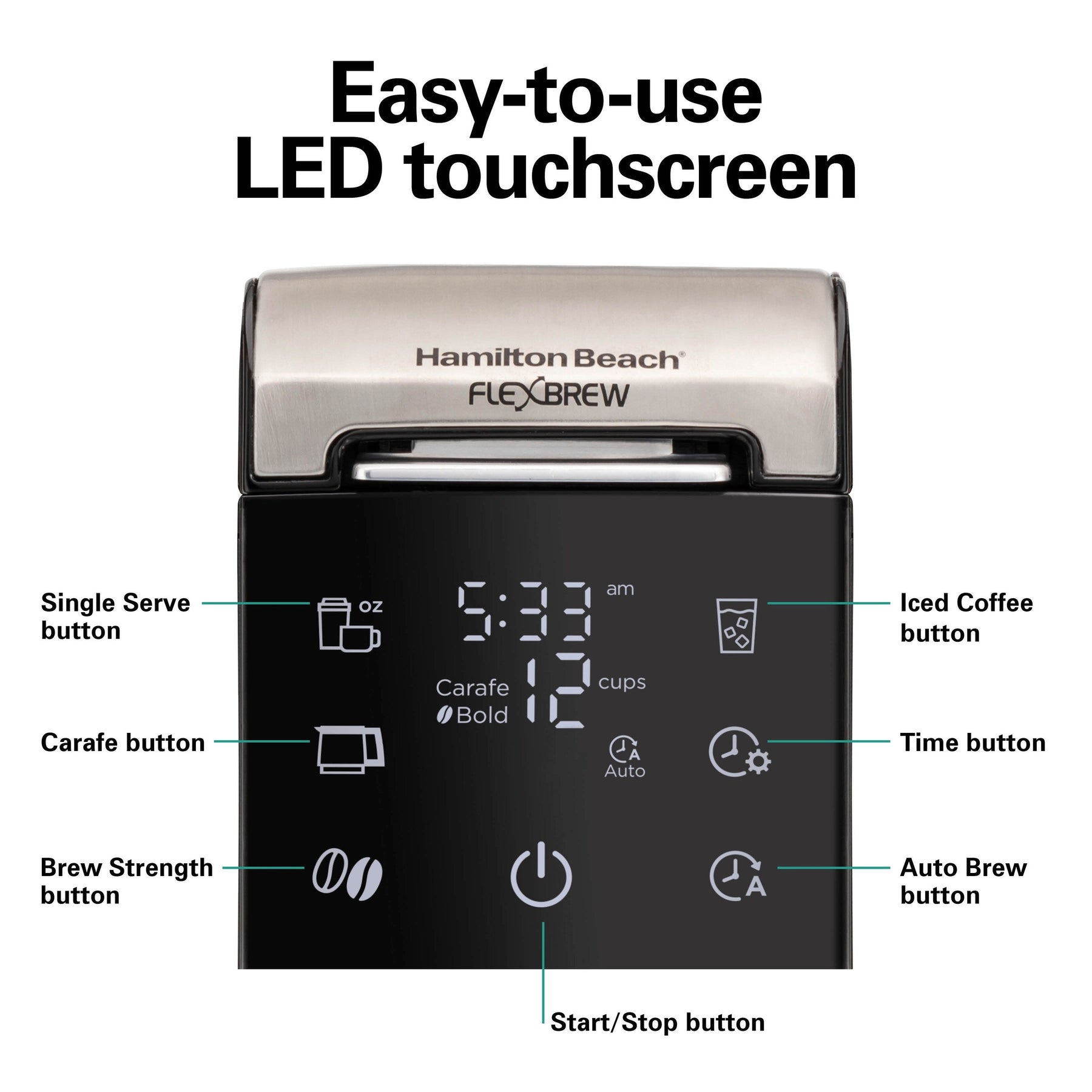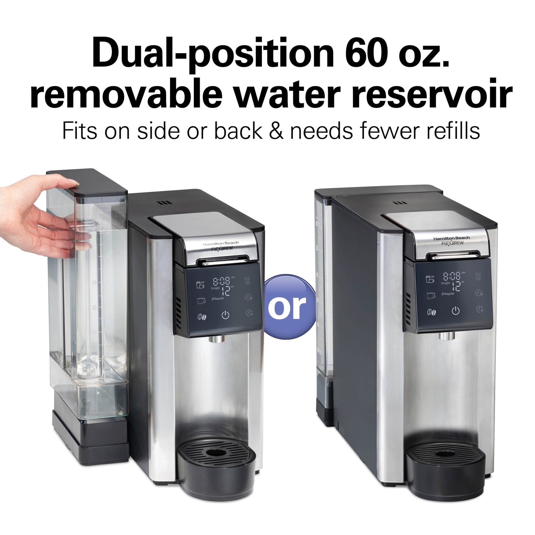 Brew a quick cup of coffee on busy mornings or make a whole carafe when you have more time. The Hamilton Beach® FlexBrew® Advanced 5-in-1 Coffee Maker fits every brewing preference and schedule, whether you want an iced or hot single cup or a whole carafe of hot coffee. Brew a travel mug or regular cup with a K-Cup®* pods or ground coffee. Enjoy multiple servings made with ground coffee in the 12 cup thermal carafe. No matter how you brew, the large 60 oz. removable water reservoir needs fewer refills, and has dual-position flexibility to fit on the back or side. Place it on the back for a space-saving design that's over 40% narrower** or place it on the side for easy access and fast refilling. Features an easy-to-use LED touchscreen with multiple brewing options and auto shutoff. Includes 12 cup stainless steel thermal carafe, 60 oz. removable water reservoir, pod holder and brew basket for single-serve ground coffee.
