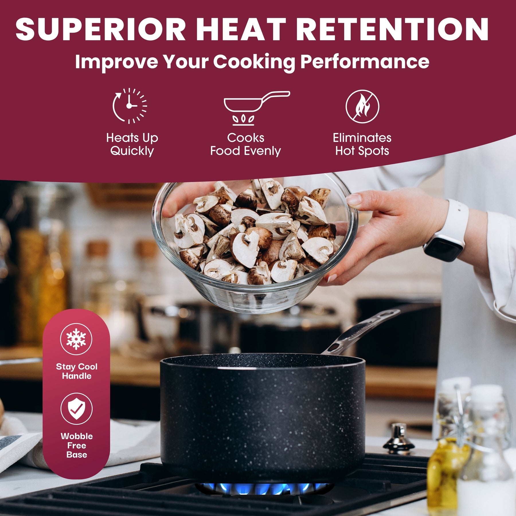 Safe and Family Friendly: Made without PFOA, PFOS, lead, or cadmium for peace of mind; the stay-cool handles and wobble-free bases add safety and stability to every cooking session.
