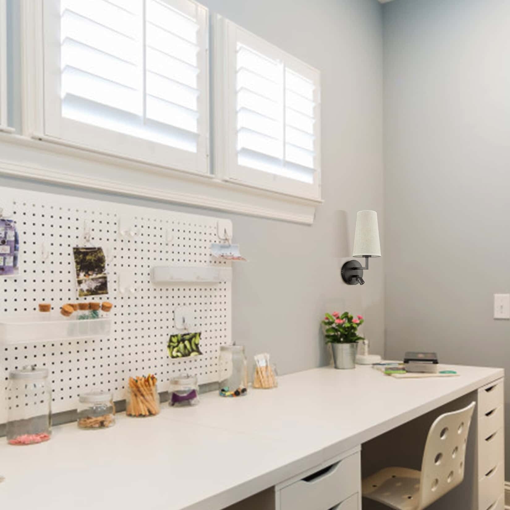 The brass gold or black  wall sconce consists of round metal plate with USB charging port and bucket-shape white fabric lamp shade, creating a classic and modern charm decor in your living spaces. The switch on the left one controls LED reading light, the right one controls the E26 bulb. (Bulb Not Included)
