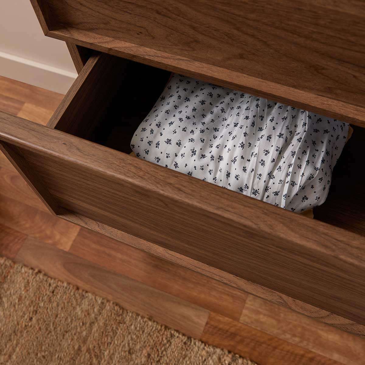 The walnut wood-look finish, paired with the framed drawer profiles, adds a modern yet timeless style that complements both contemporary and classic interiors.