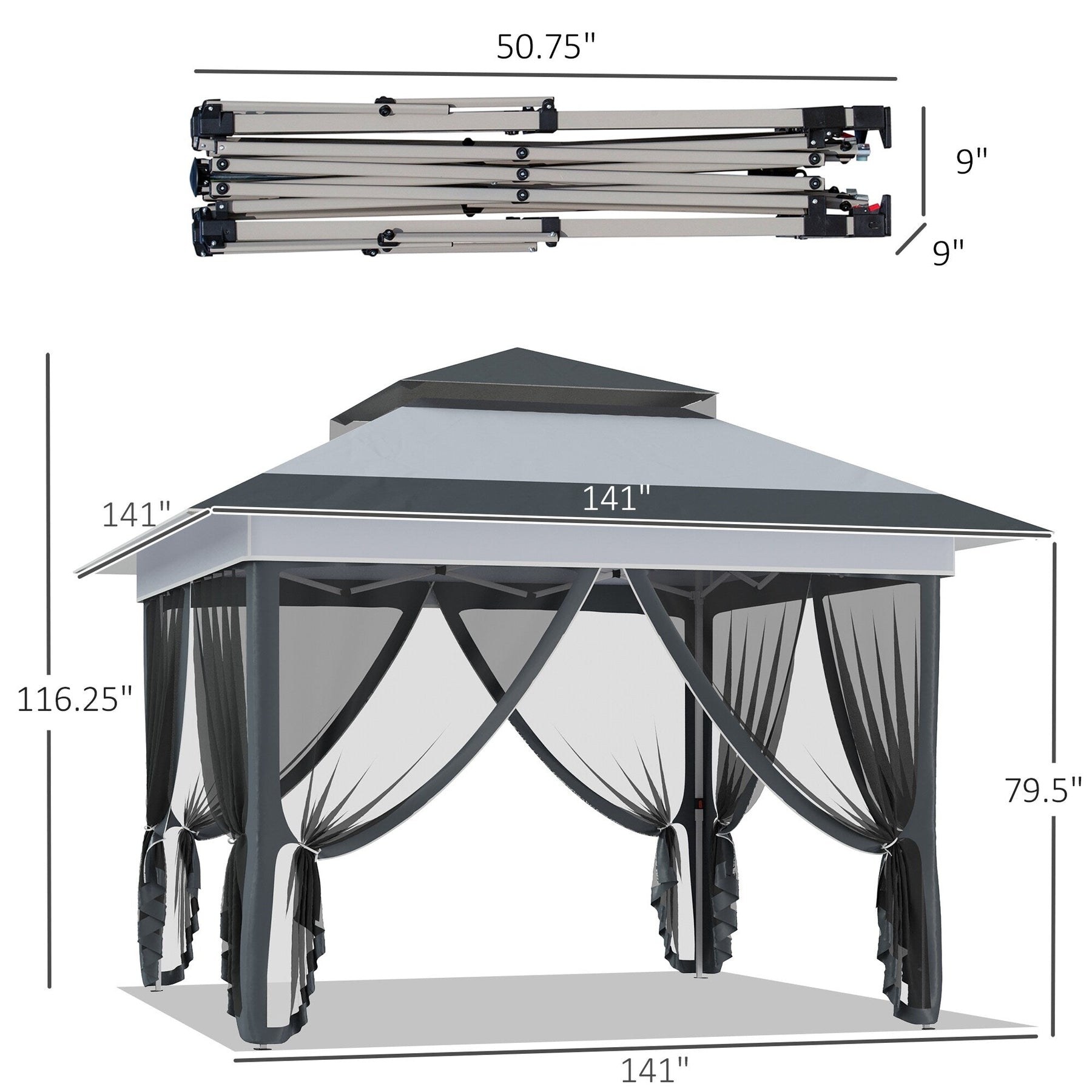 Pop-in pop-up and pop-out with Outsunny. This instant canopy sets up fast and can provide spacious protection from the sun. Use the breathable mesh sidewalls to provide a comfortable sitting space. The vented top of our foldable party tent is also netted, working together with the ropes and support stakes; it provides a more stable structure helping it withstand winds. When you're done, push down the tent and walk away with the included carrying bag.