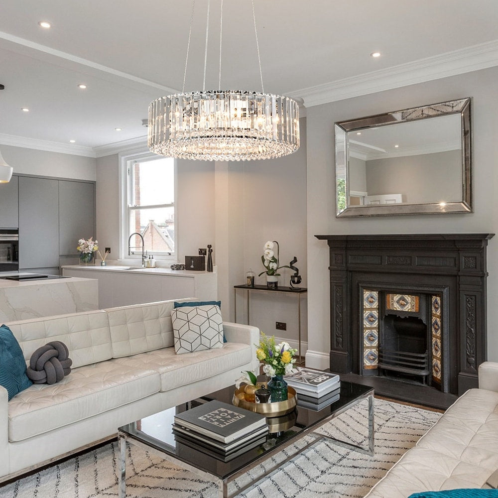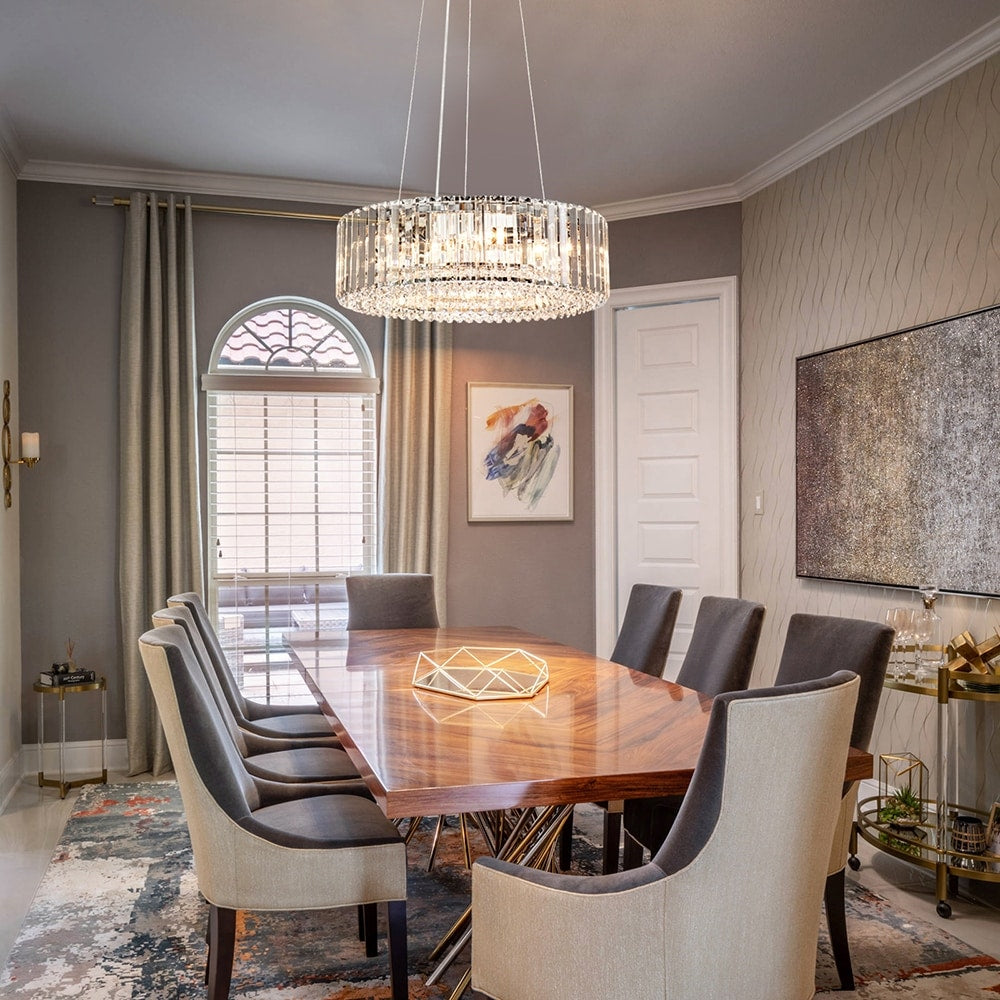 Elevate your space with the modern elegance of the OYIPRO Crystal Chandelier. Designed with a clear crystal drum shade and a sleek chrome, black, or gold circle frame, this chandelier blends timeless glamour with contemporary style. Available in 6-light, 8-light, or 12-light configurations, it provides warm, radiant illumination ideal for dining rooms, kitchens, living rooms, and more. The adjustable 59-inch hanging chain and sloped-ceiling-compatible canopy allow for flexible installation, while the high-quality crystal accents add a touch of luxury to any interior. Compatible with dimmable bulbs and switches, it’s perfect for setting the right ambiance in any setting.
