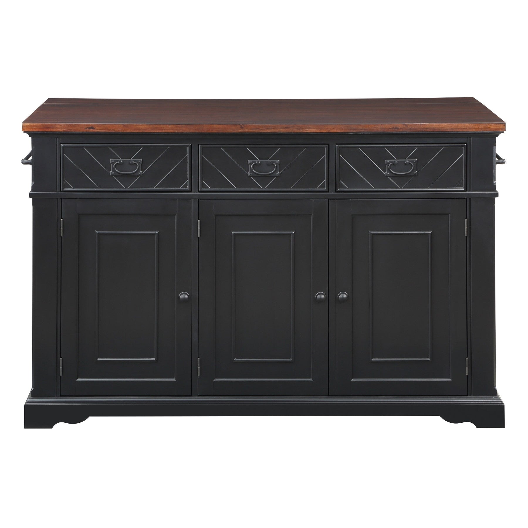 Add the warmth and charm of farmhouse style to your home with our kitchen island. Utensils are at easy reach with our 3-drawer design. Keep large pots, bowls, or countertop appliances tidy and out of sight in our spacious three door cabinet with 2 adjustable shelves. Keep cookie sheets and cutting boards arranged and organized with the convenient divided vertical storage shelves. Small spices can be displayed and handy with the flanking exterior spice racks situated just below a well-positioned towel bar. Made of solid wood and veneers and finished in an 8-step painted finish for long lasting durability. Ships in three cartons and assembly is required.