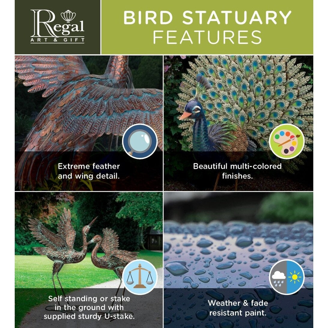 Commonly associated with Greek Mythology and also present in most ancient cultures, the legend of the Phoenix portrays this magnificent bird leaving paradise and entering the mortal world to be burned up by a great fire to be born again. It is a long and detailed wonderful story. This great bird symbolizes purification, transformation, rebirth, and a new life. Incredible metal detail. Metallic paint. Weather & fade resistant paints. Indoor/outdoor use.