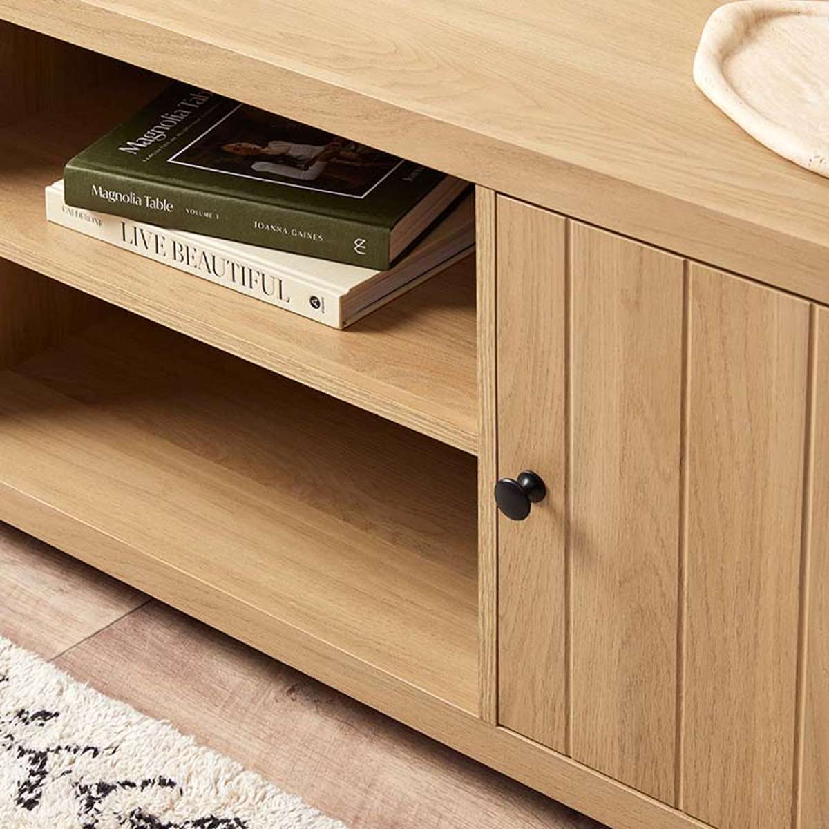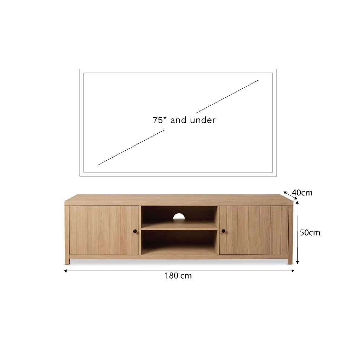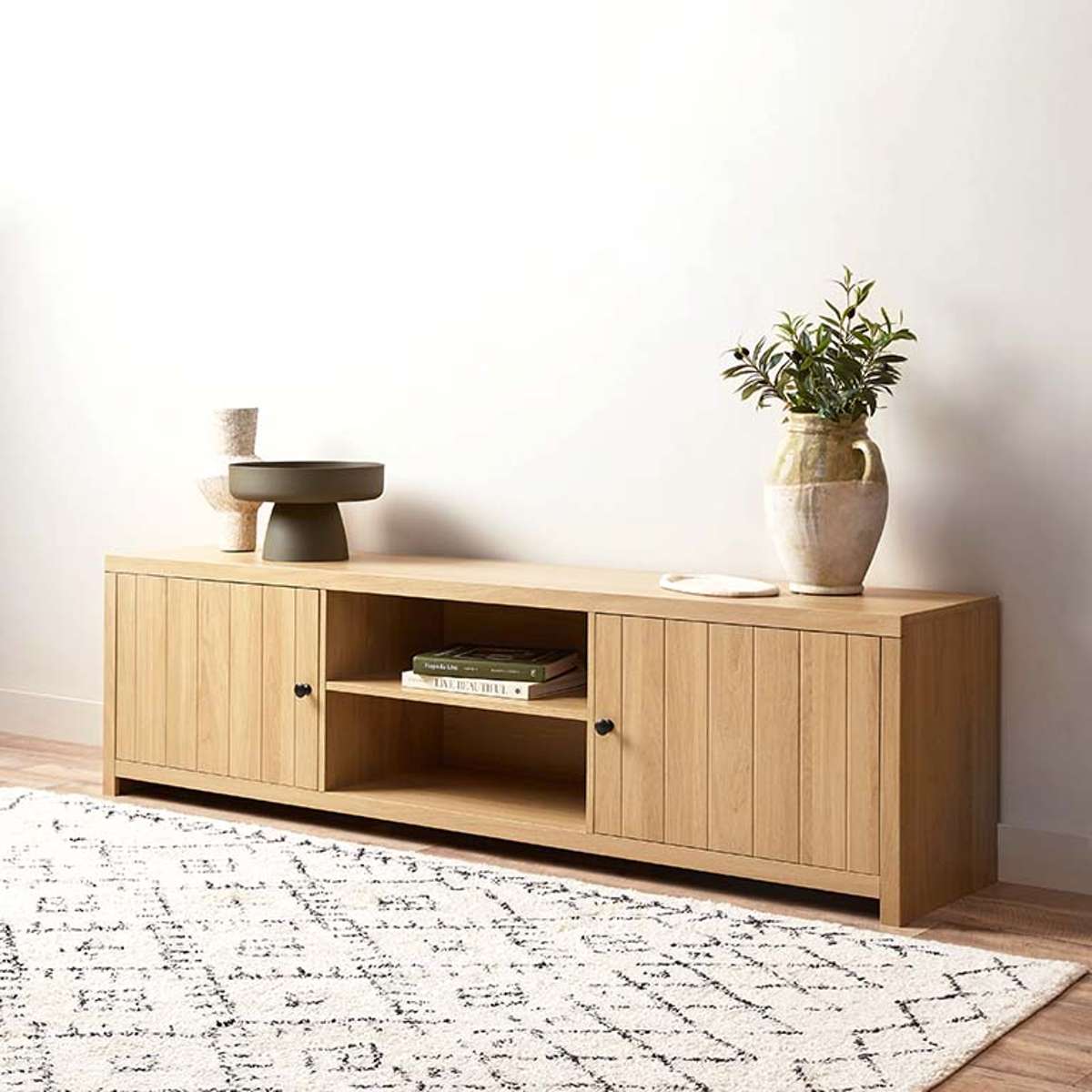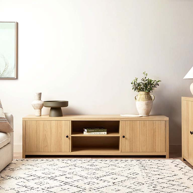 Upgrade your living space with the Portland Entertainment Unit - Natural. Featuring a warm wood-look finish, timeless grooves, and a farmhouse style, this 1.8m TV unit suits cosy and classic interiors. With 2 cupboard doors and 2 open shelves, it offers versatile storage for everything from devices to décor. Perfect for your lounge, family room or media space.