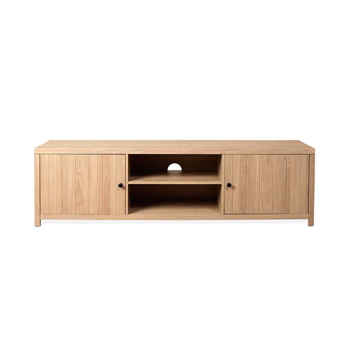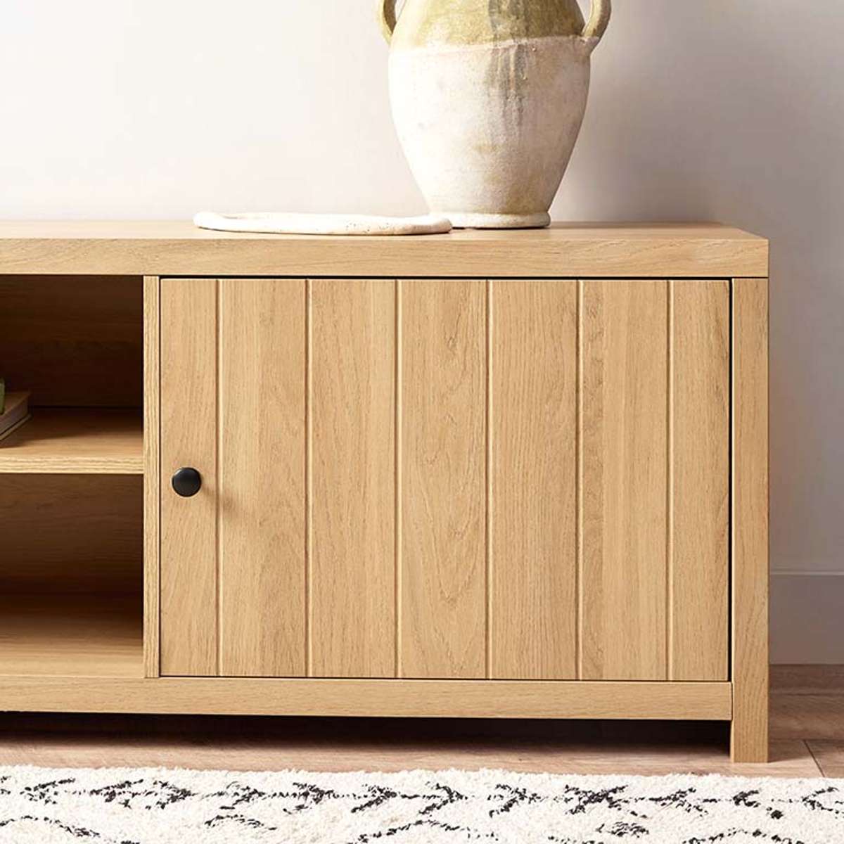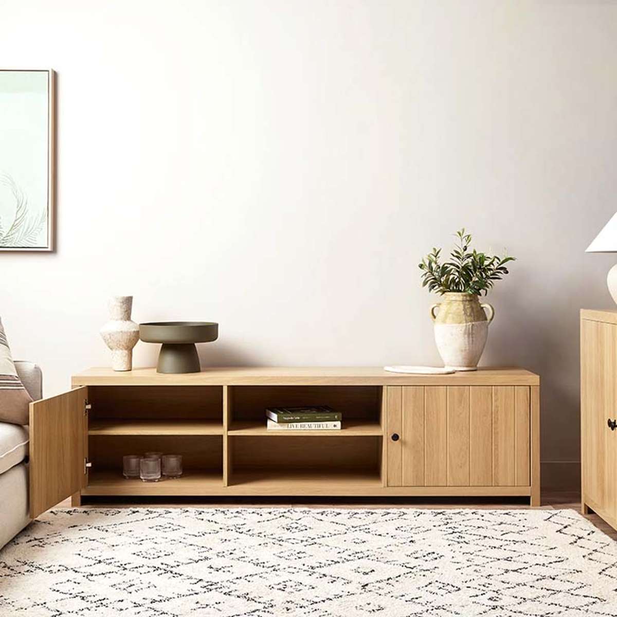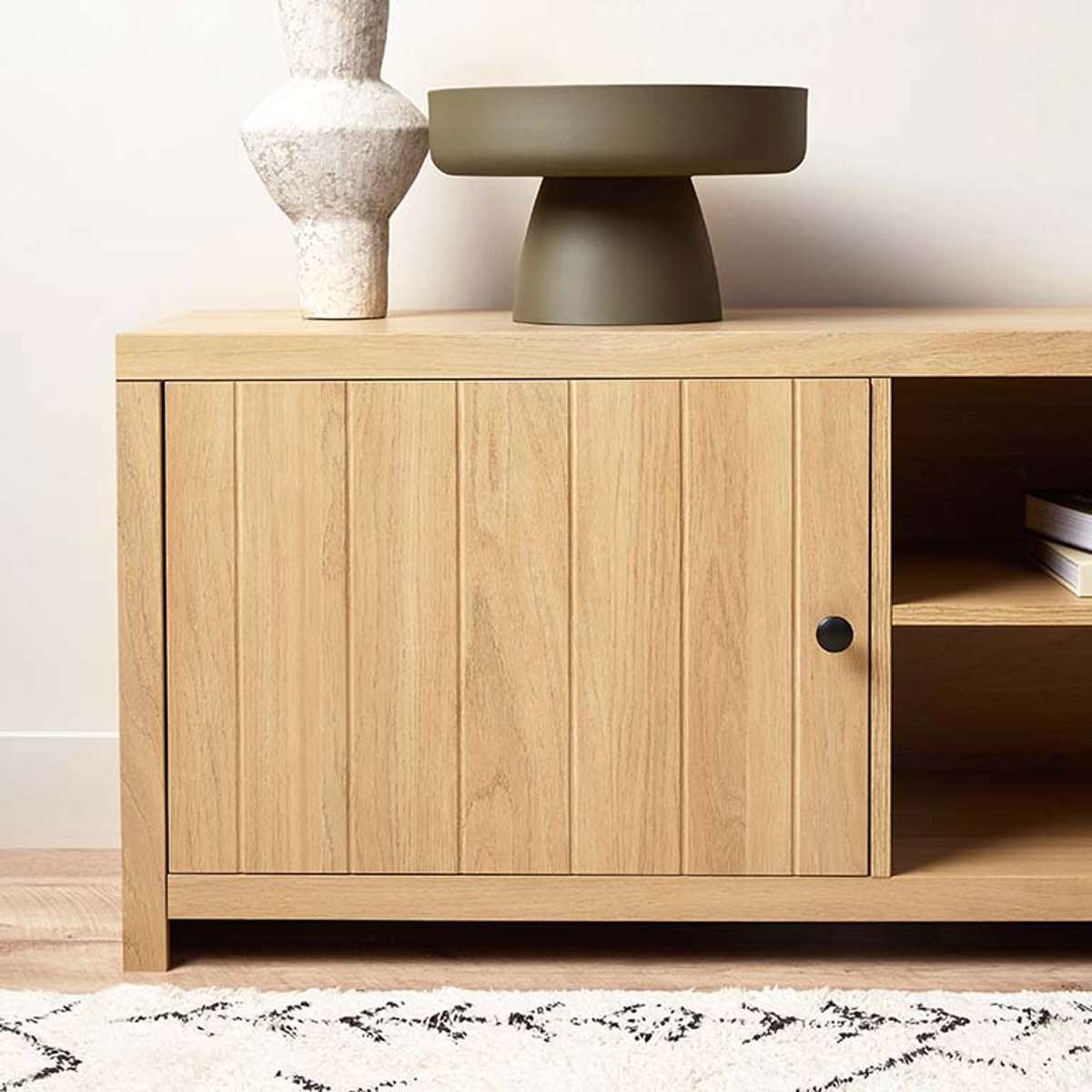 Upgrade your living space with the Portland Entertainment Unit - Natural. Featuring a warm wood-look finish, timeless grooves, and a farmhouse style, this 1.8m TV unit suits cosy and classic interiors. With 2 cupboard doors and 2 open shelves, it offers versatile storage for everything from devices to décor. Perfect for your lounge, family room or media space.
