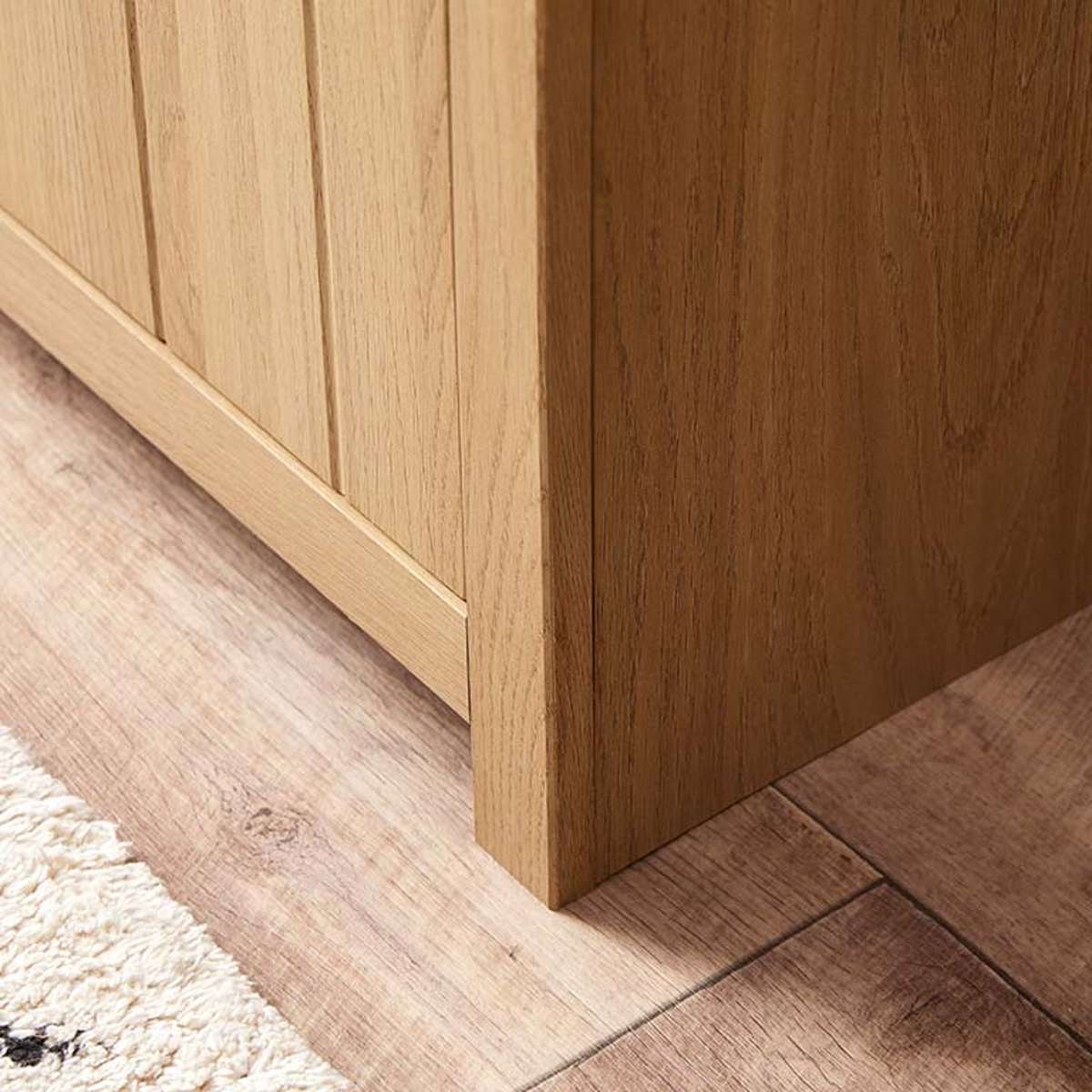 The Portland Entertainment Unit features a classic farmhouse style with detailed door grooves. Its warm wood-look perfectly complements various room styles, providing a cosy and inviting atmosphere.