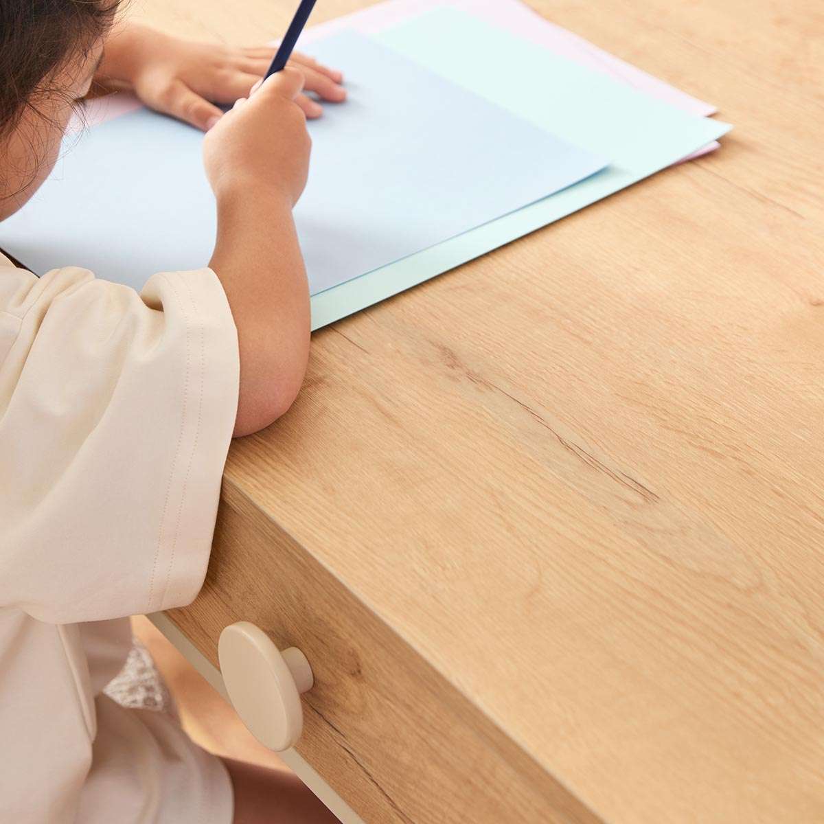 Two drawers with oversized cream knobs keep essentials tidy and within reach. Perfect for organising school supplies, books, or craft materials, helping kids stay focused and clutter-free.