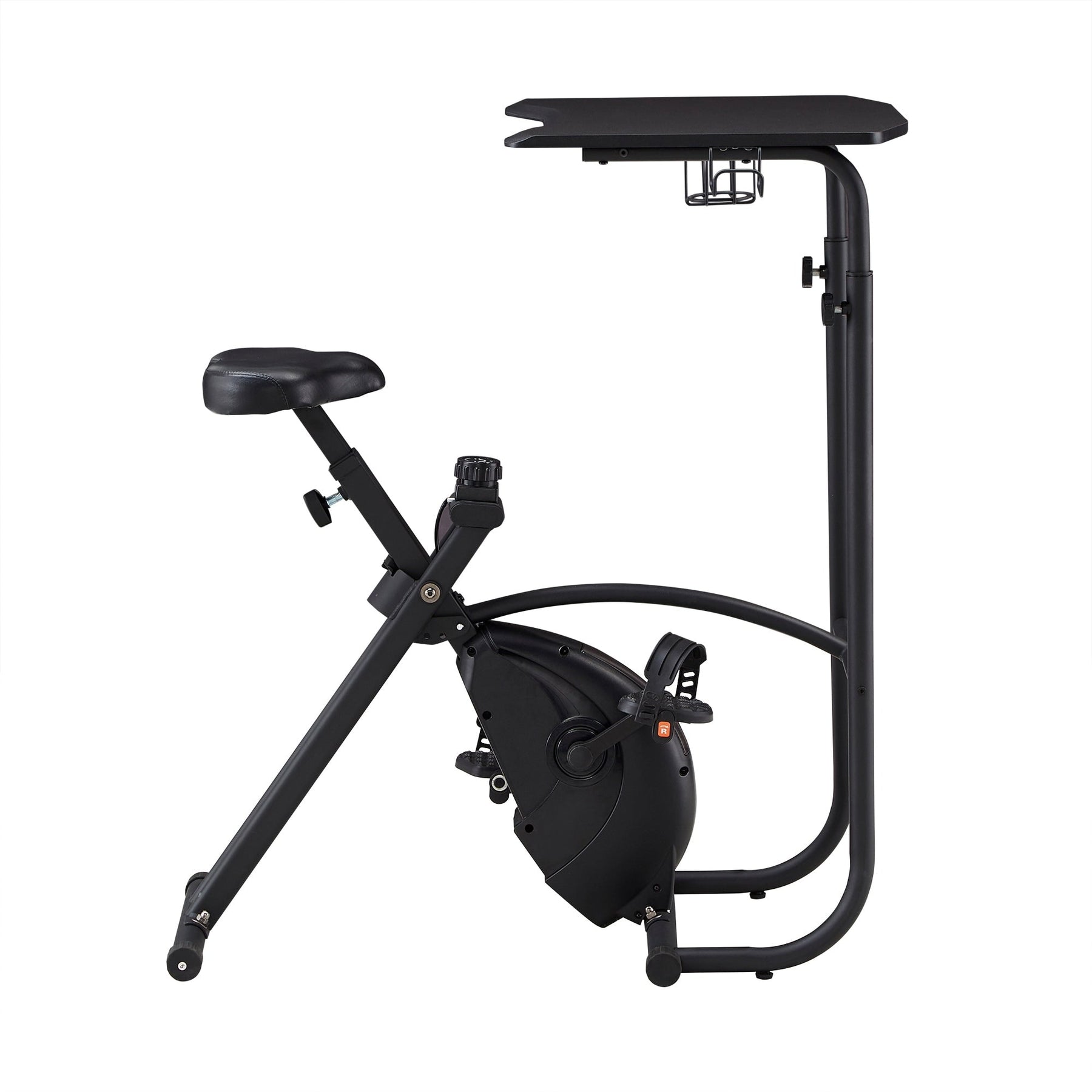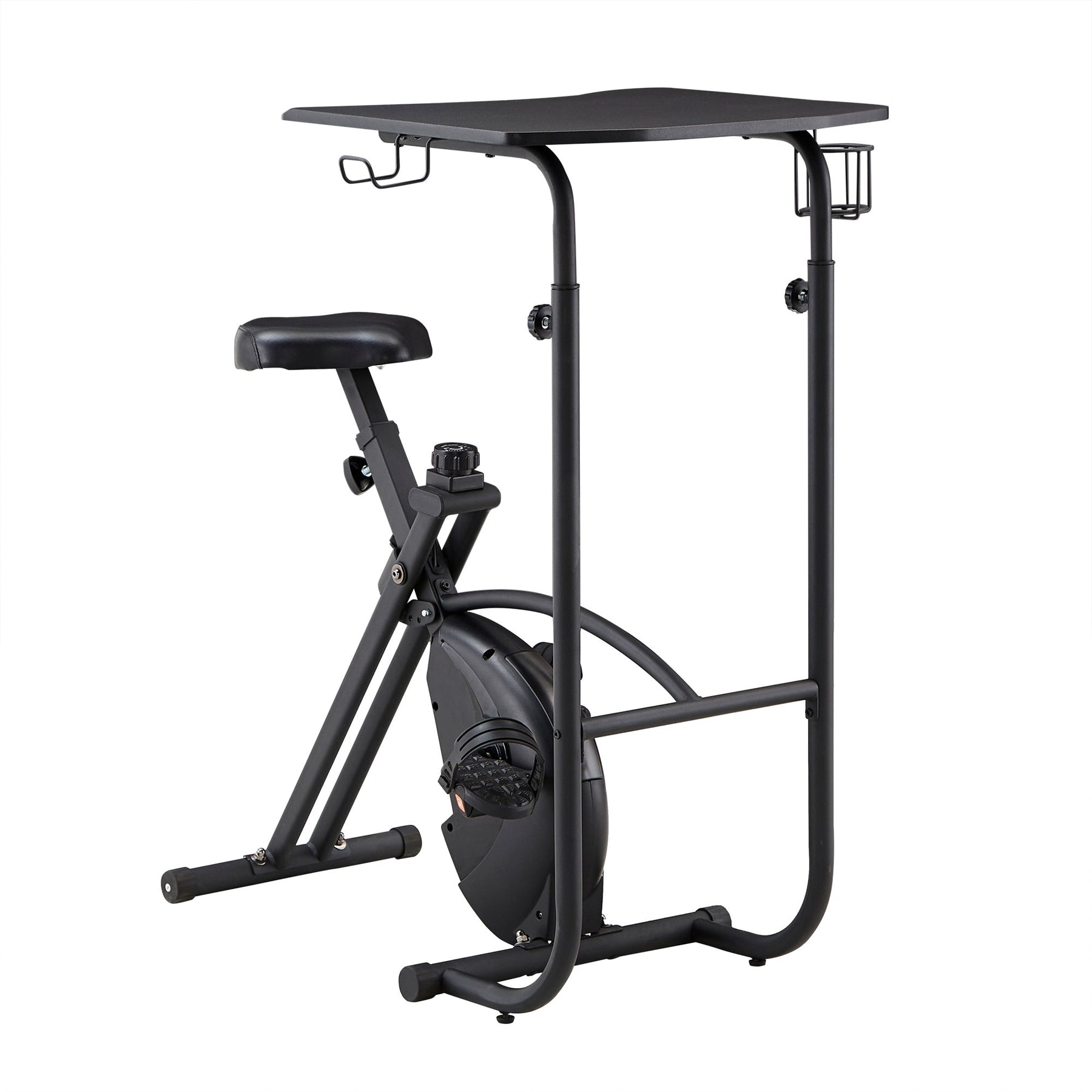 Stay active as you work with the Virgil Exercise Bike Desk by iNSPIRE Q Classic Perfect for spaces large and small, this ergonomic piece merges an exercise bike with a desk. Comfort and security comes from the padded seat and textured pedals with straps. The adjustable desktop features two side holders for a water bottle and your headphones, so everything you need is in one convenient place.