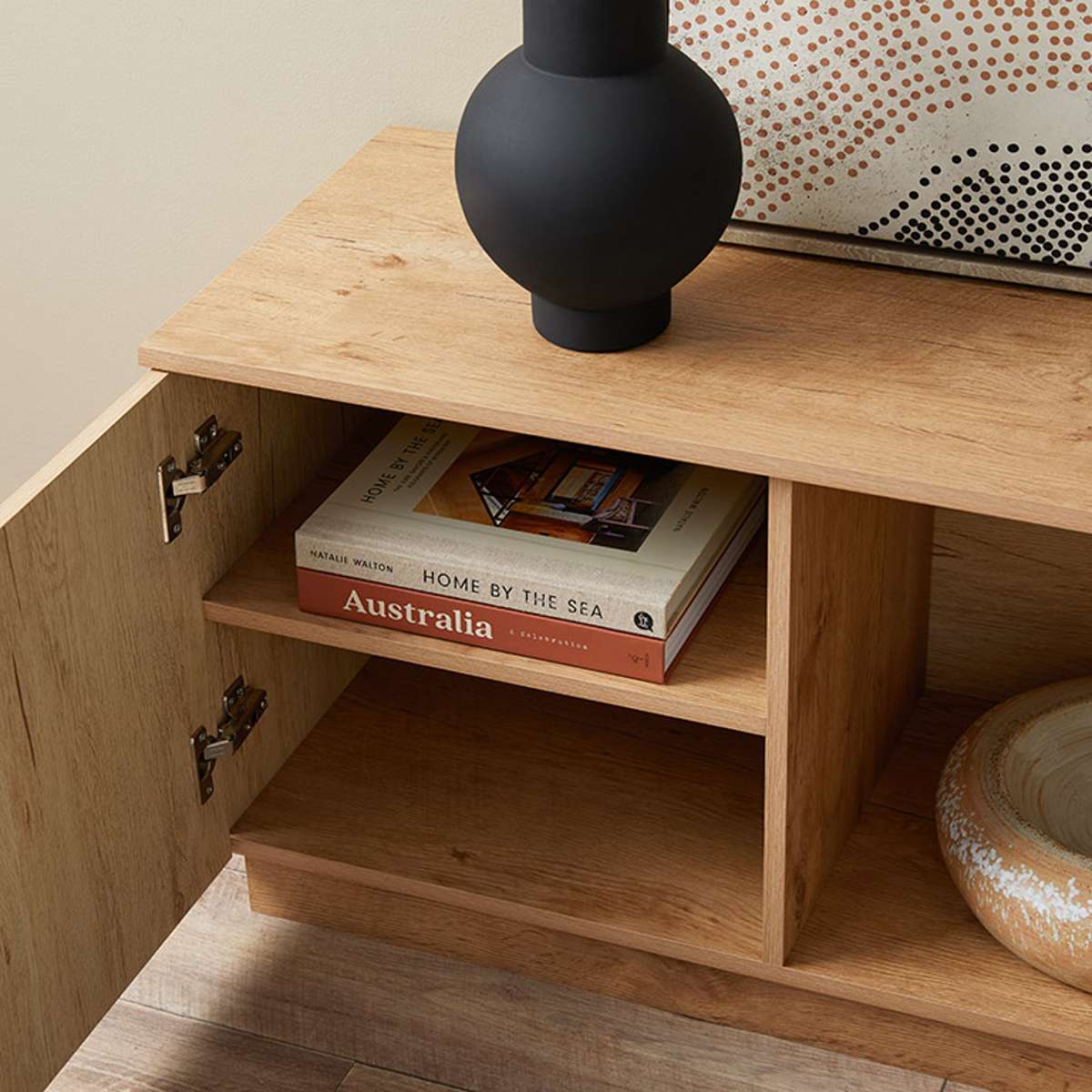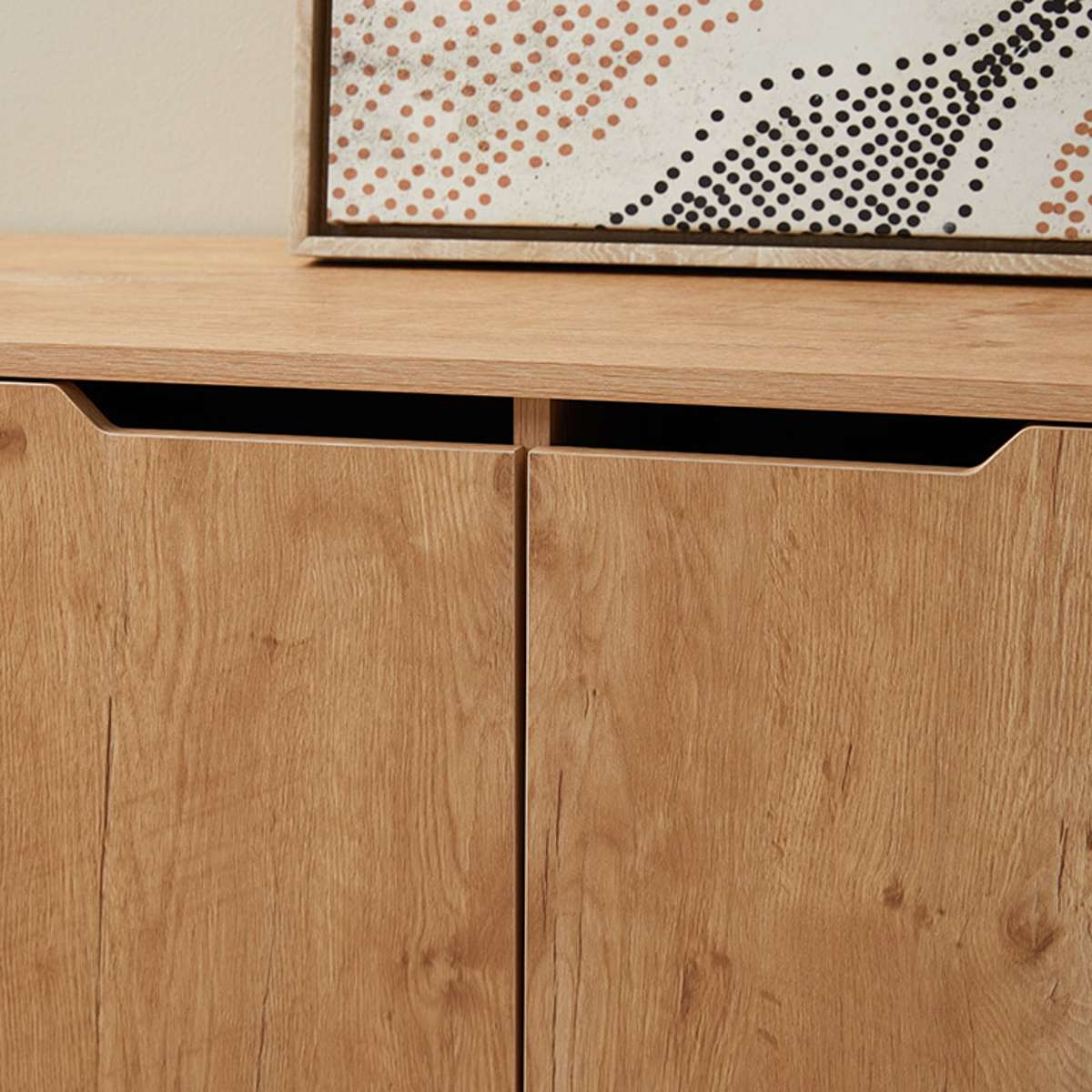 Inspired by Scandinavian design principles, Zack combines natural wood-look finishes and cut-out handles. This piece effortlessly elevates your living space, adding a contemporary charm while providing easy access to essentials. A design statement that's also versatile.
